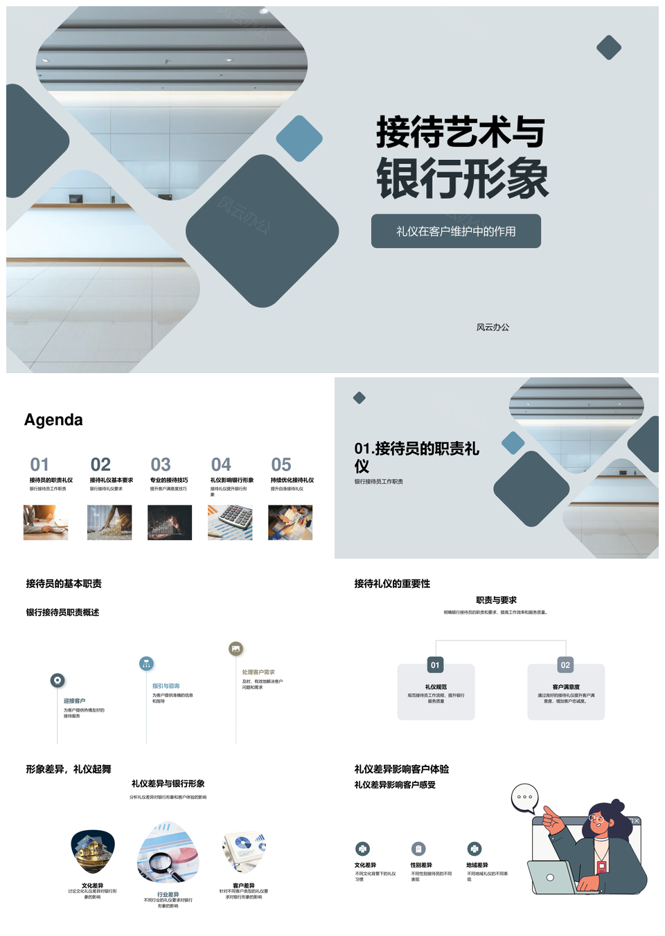 风云办公提供的银行接待礼仪培训提升客户满意度形象PPT模板,下载格式为pptx,一共28页,作品中文字及图均可以修改和编辑,图片更改请在作品中右键图片并更换,文字修改请直接点击文字进行修改。