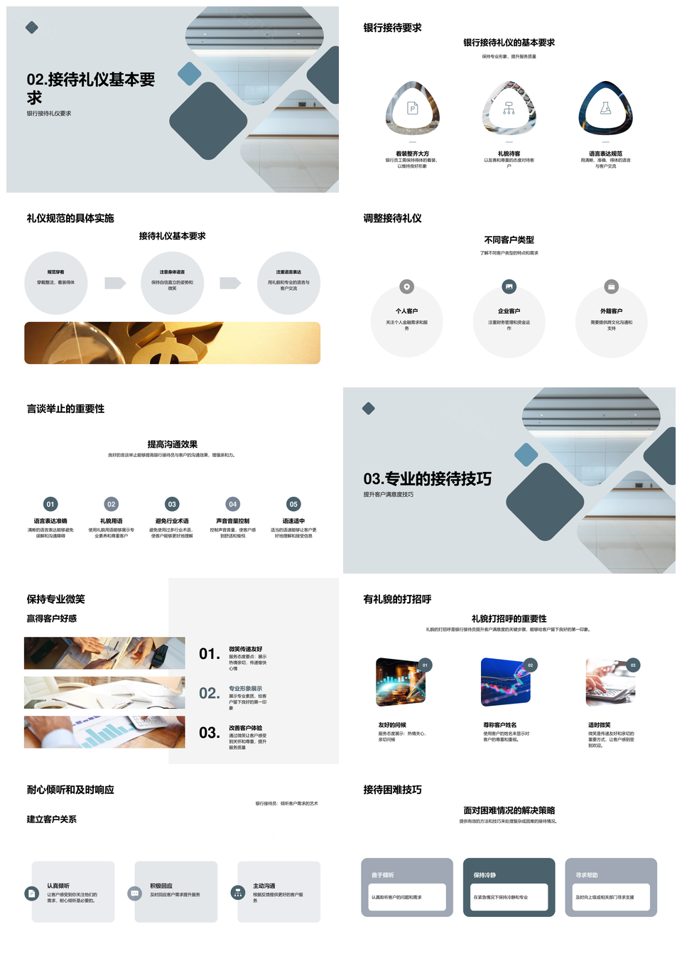 这是一张银行接待礼仪培训提升客户满意度形象PPT模板,包含银行、接待礼仪、培训、提升、客户满意度、形象等主题内容,也可用作银行接待礼仪培训、接待礼仪培训提升、礼仪培训提升客户、培训提升客户满意度、提升客户满意度形象、银行接待礼仪、接待礼仪培训、礼仪培训提升、培训提升客户、提升客户满意度、客户满意度形象、银行接待、接待礼仪、礼仪培训、培训提升等PPT场景使用。