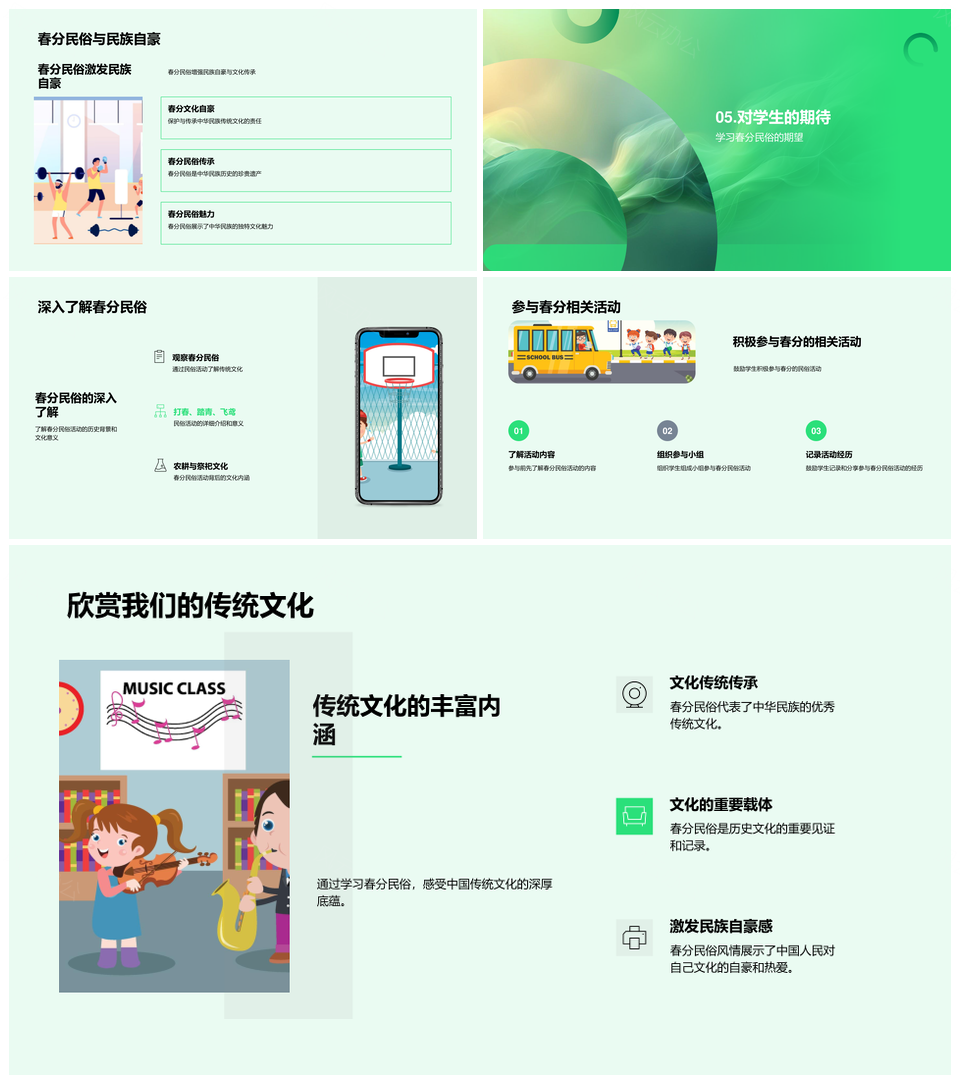 这套模板以浅绿为基底色调,搭配墨绿渐变,构建出自然柔和的视觉层次。设计采用极简框架,大面积留白平衡图文排版,剔除冗余装饰,聚焦内容呈现。细节融入传统窗花纹样与水墨笔触,呼应中国风内核,结合日系清新的植物插画元素,淡雅不失灵动。复古纸张肌理与手写字体点缀,增添文艺氛围,适用于商务汇报、文化沙龙等场景。内置节日主题延展页,可快速适配节气活动策划,整体风格统一,兼具专业性与美学考量,满足高效演示需求。