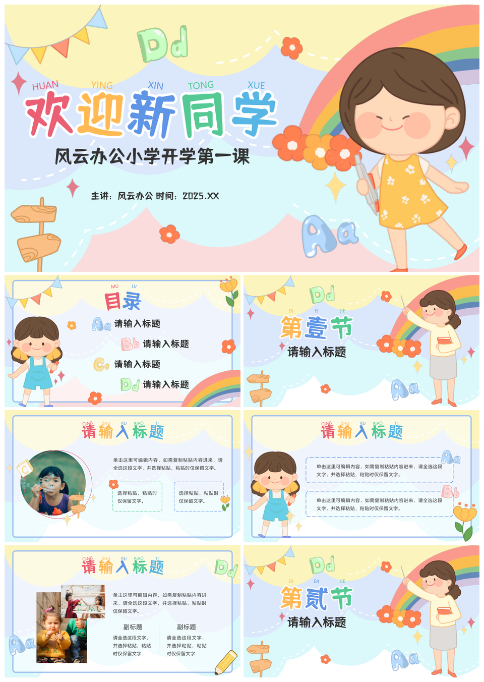 这是一张2025主题教育班会新学期卡通迎新自我介绍见面会PPT模板,包含2025、主题教育、班会、新学期、卡通、迎新、自我介绍、见面会等主题内容,也可用作2025主题教育班会新学期、主题教育班会新学期卡通、班会新学期卡通迎新、新学期卡通迎新自我介绍、卡通迎新自我介绍见面会、2025主题教育班会、主题教育班会新学期、班会新学期卡通、新学期卡通迎新、卡通迎新自我介绍、迎新自我介绍见面会、2025主题教育、主题教育班会、班会新学期、新学期卡通等PPT场景使用。 风云办公提供的2025主题教育班会新学期卡通迎新自我介绍见面会PPT模板,下载格式为pptx,一共19页,作品中文字及图均可以修改和编辑,图片更改请在作品中右键图片并更换,文字修改请直接点击文字进行修改。