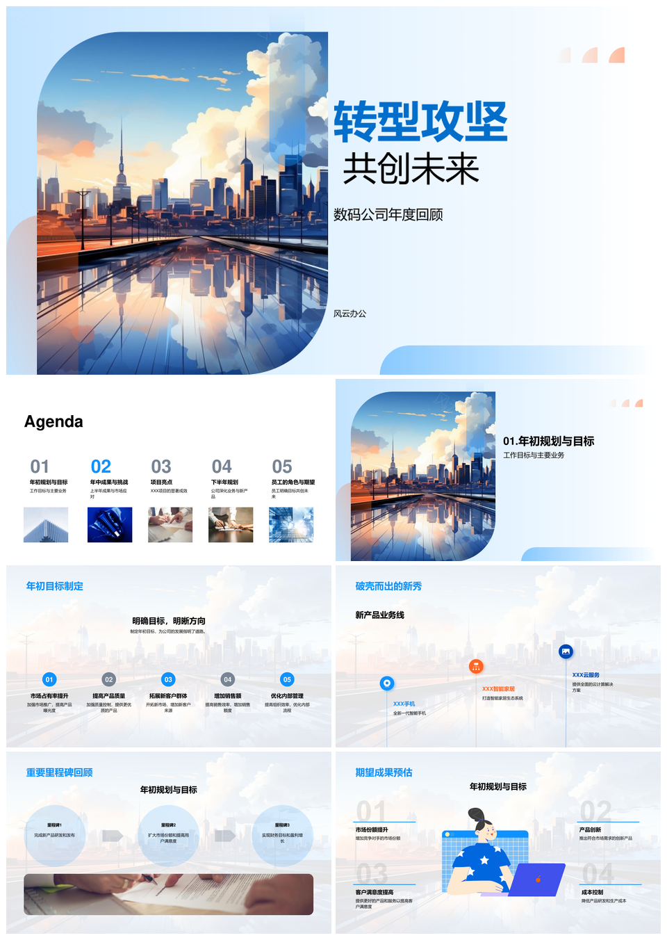 风云办公提供的数码公司转型攻坚年度回顾共创未来PPT模板,下载格式为pptx,一共33页,作品中文字及图均可以修改和编辑,图片更改请在作品中右键图片并更换,文字修改请直接点击文字进行修改。