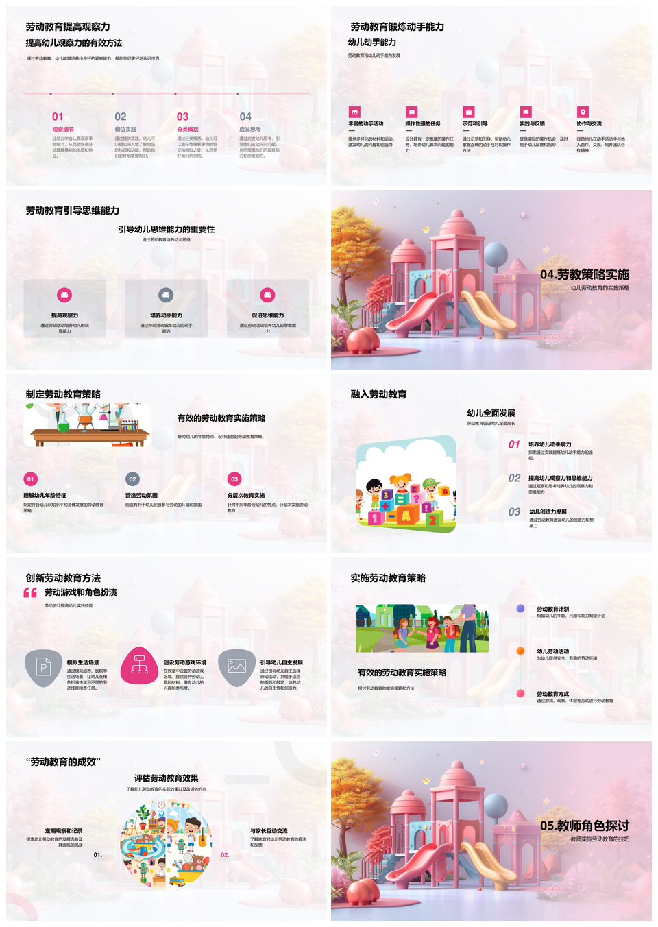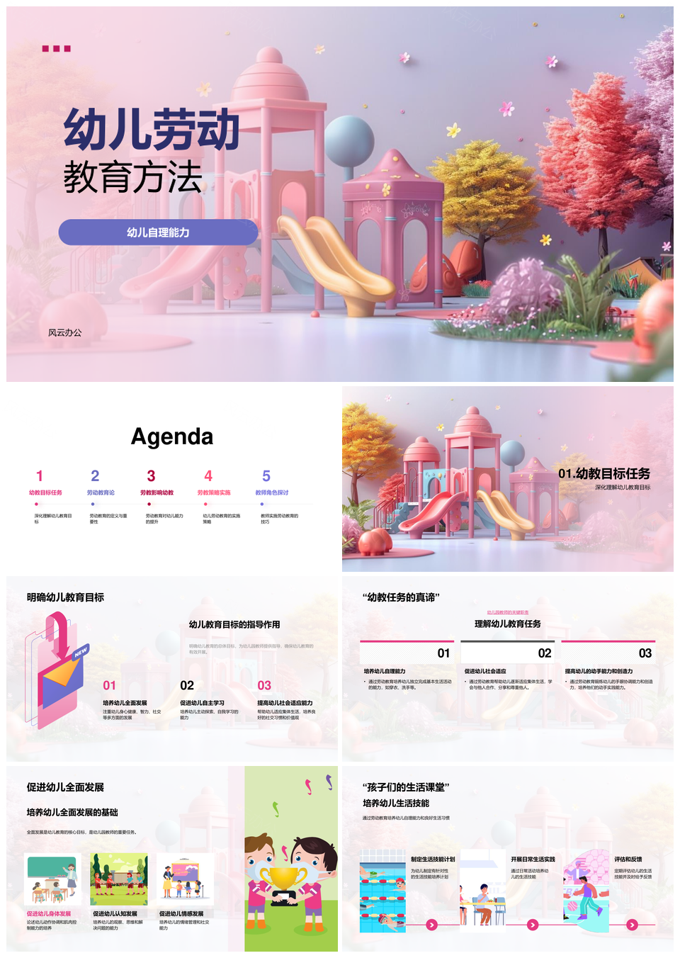 风云办公提供的幼儿劳动教育自理动手思维方法PPT模板,下载格式为pptx,一共33页,作品中文字及图均可以修改和编辑,图片更改请在作品中右键图片并更换,文字修改请直接点击文字进行修改。