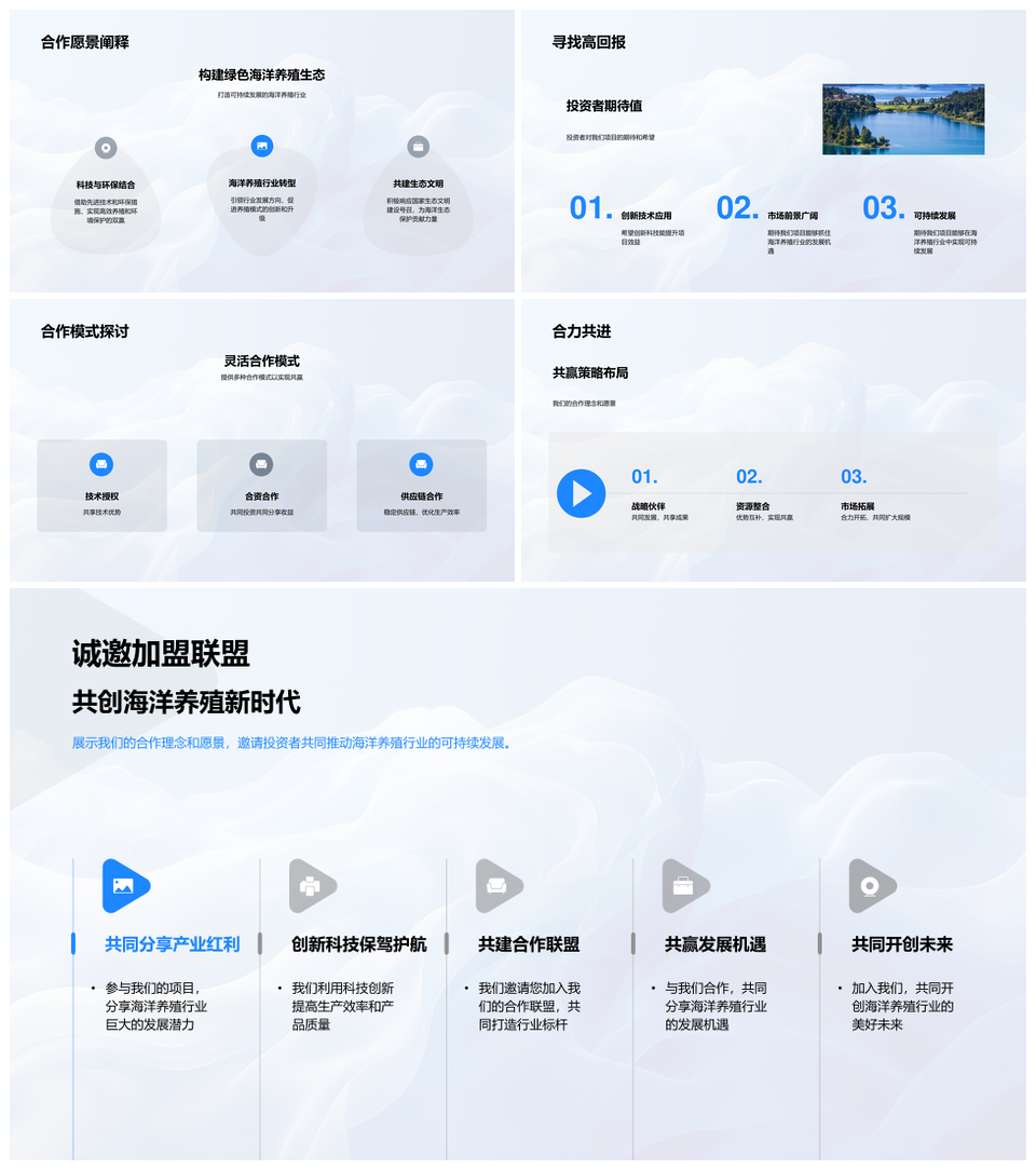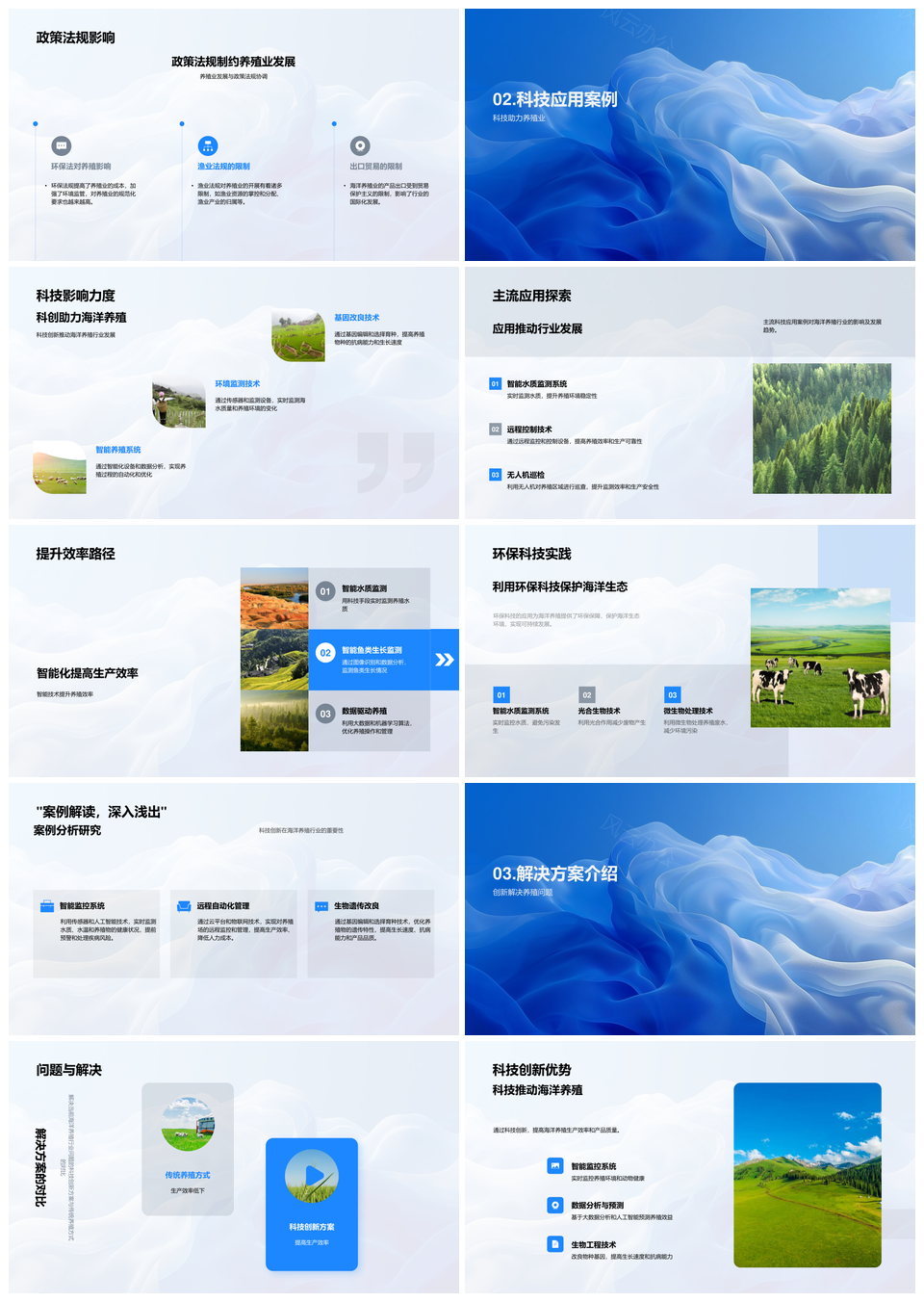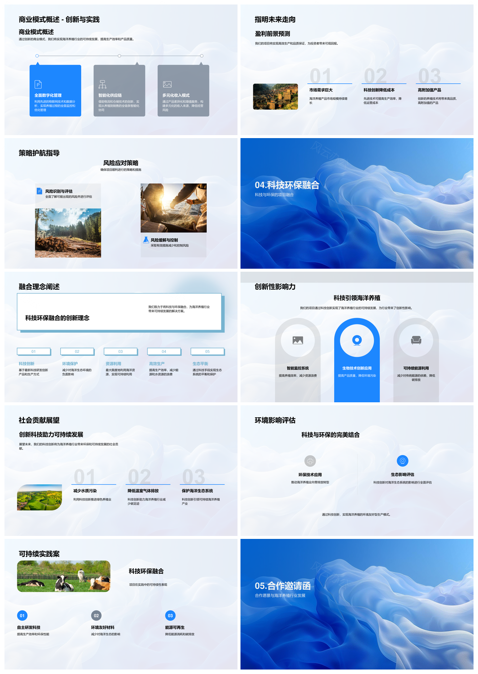 这是一张海洋养殖科技革新环保高效全球行业实践PPT模板,包含海洋养殖、科技、革新、环保、高效、全球、行业、实践等主题内容,也可用作海洋养殖科技革新、科技革新环保高效、环保高效全球行业、养殖科技革新、科技革新环保、革新环保高效、环保高效全球、高效全球行业、全球行业实践、海洋养殖、养殖科技、科技革新、革新环保、环保高效、高效全球等PPT场景使用。 风云办公提供的海洋养殖科技革新环保高效全球行业实践PPT模板,下载格式为pptx,一共33页,作品中文字及图均可以修改和编辑,图片更改请在作品中右键图片并更换,文字修改请直接点击文字进行修改。