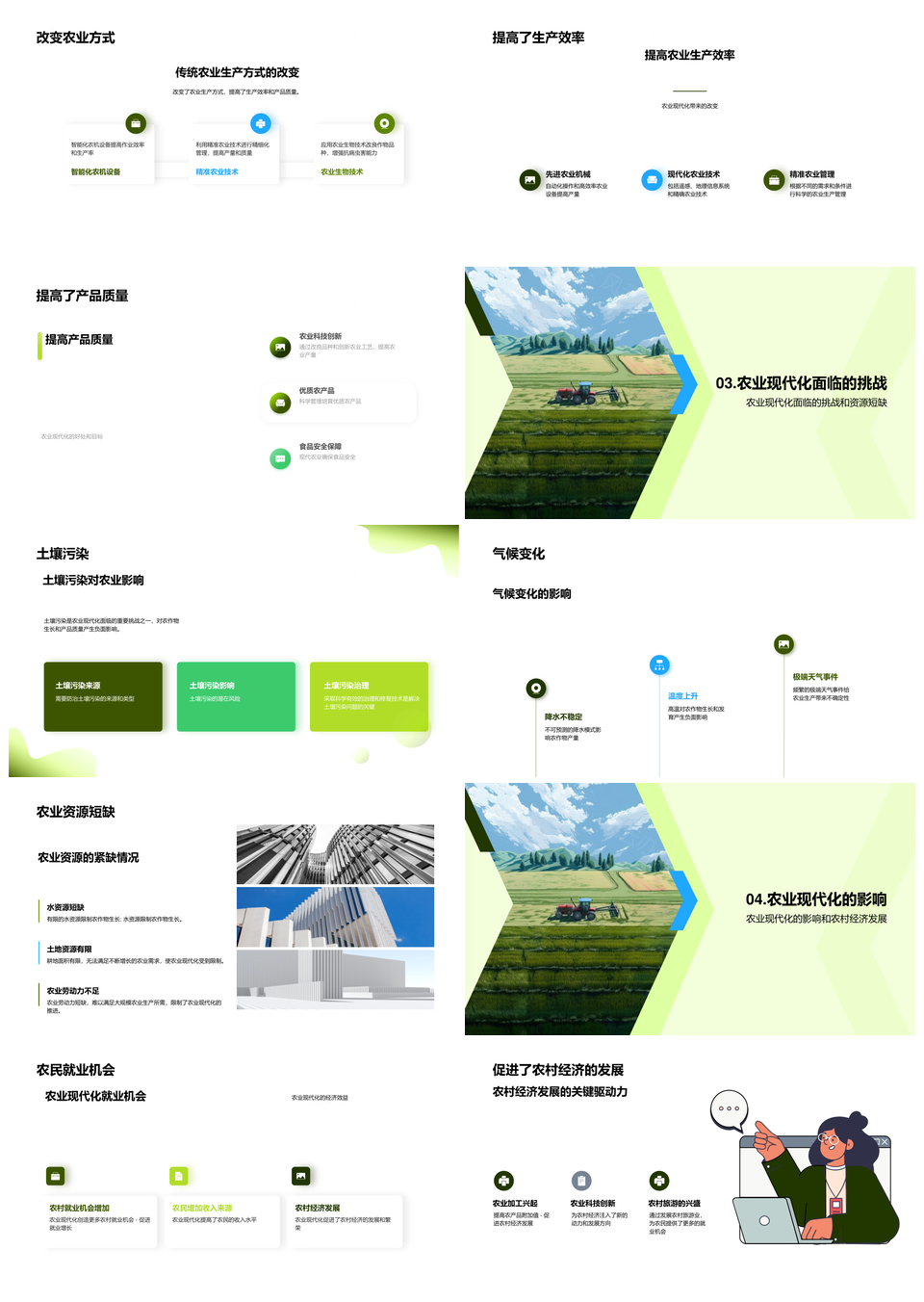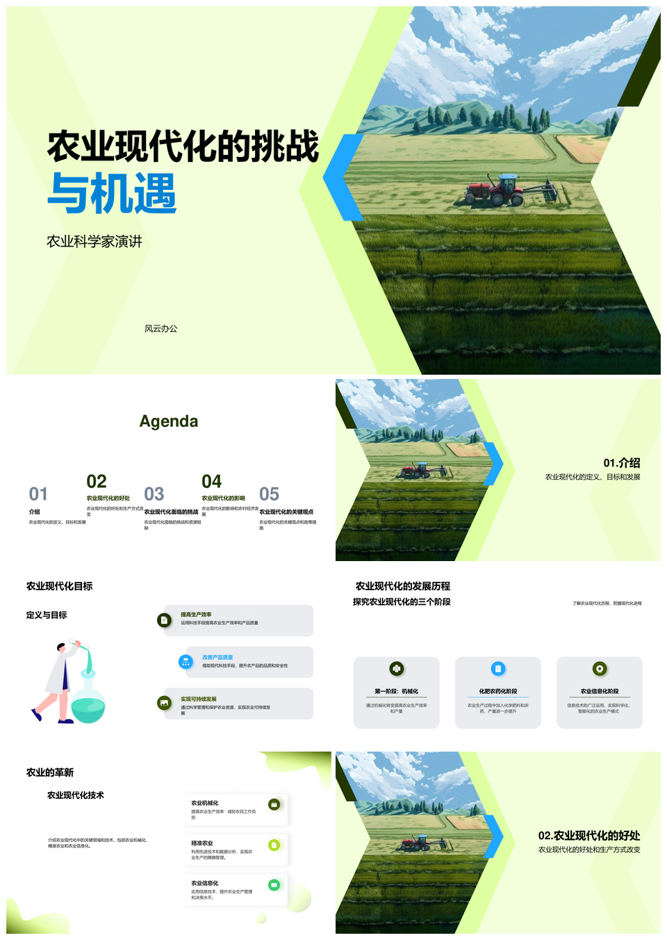 风云办公提供的农业现代化挑战机遇科学生产高效提质PPT模板,下载格式为pptx,一共24页,作品中文字及图均可以修改和编辑,图片更改请在作品中右键图片并更换,文字修改请直接点击文字进行修改。