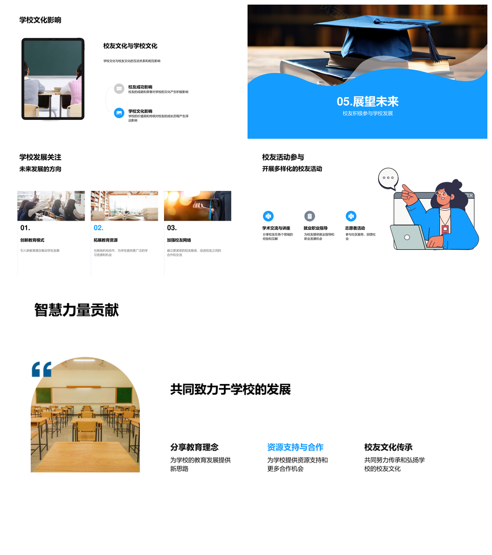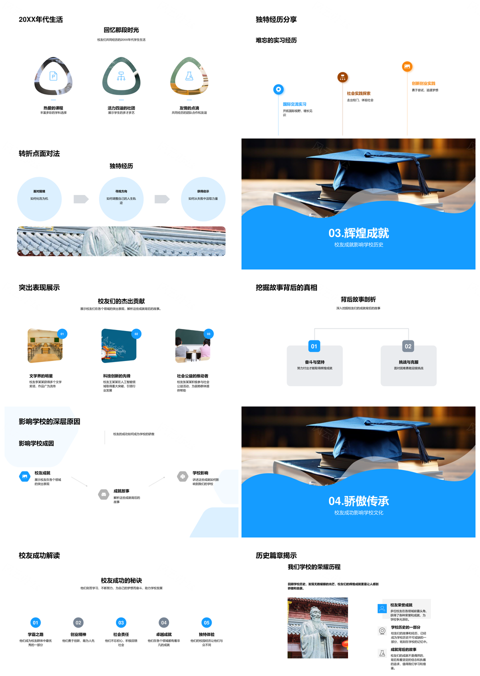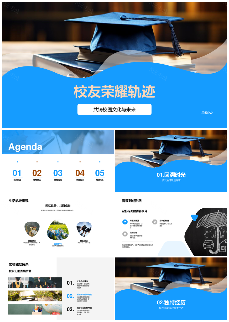 风云办公提供的校友荣光岁月校园文化成长历程PPT模板,下载格式为pptx,一共23页,作品中文字及图均可以修改和编辑,图片更改请在作品中右键图片并更换,文字修改请直接点击文字进行修改。