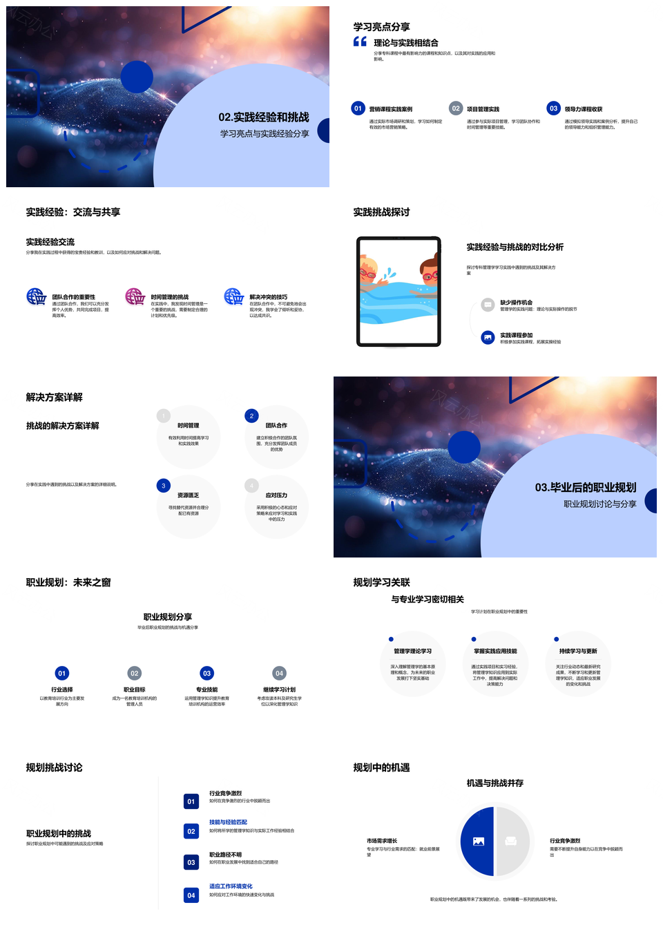 这是一张专科毕业答辩课程实践职业规划管理理论挑战解决方案PPT模板,包含专科毕业、答辩、课程实践、职业规划、管理理论、挑战、解决方案等主题内容,也可用作专科毕业答辩课程实践职业规划、毕业答辩课程实践职业规划管理理论、课程实践职业规划管理理论挑战、职业规划管理理论挑战解决方案、专科毕业答辩课程实践、毕业答辩课程实践职业规划、课程实践职业规划管理理论、职业规划管理理论挑战、管理理论挑战解决方案、专科毕业答辩、毕业答辩课程实践、课程实践职业规划、职业规划管理理论、管理理论挑战、挑战解决方案等PPT场景使用。 风云办公提供的专科毕业答辩课程实践职业规划管理理论挑战解决方案PPT模板,下载格式为pptx,一共26页,作品中文字及图均可以修改和编辑,图片更改请在作品中右键图片并更换,文字修改请直接点击文字进行修改。