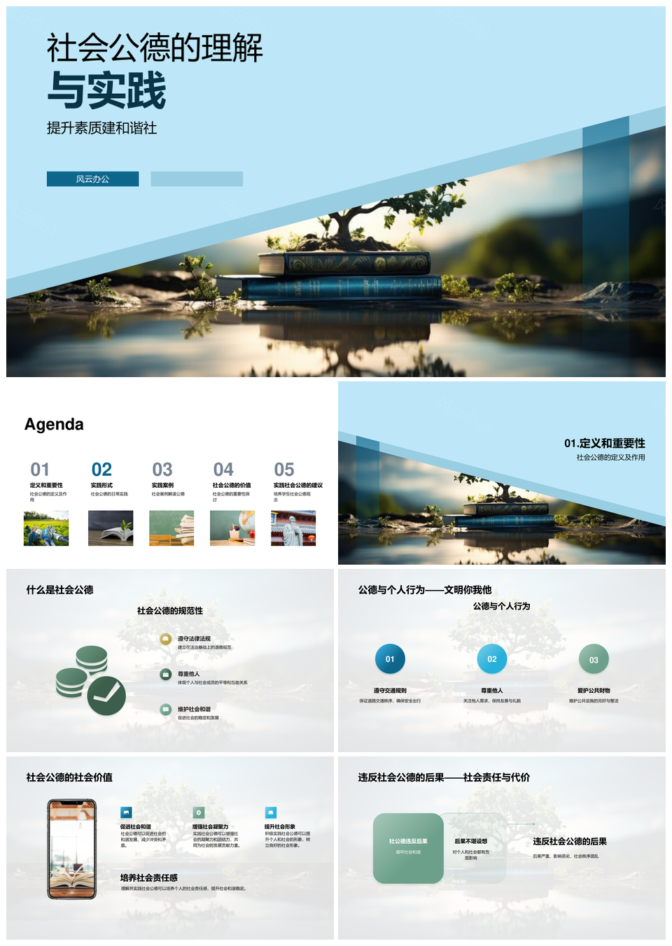 风云办公提供的社会公德实践提升素质共建和谐生活PPT模板,下载格式为pptx,一共33页,作品中文字及图均可以修改和编辑,图片更改请在作品中右键图片并更换,文字修改请直接点击文字进行修改。