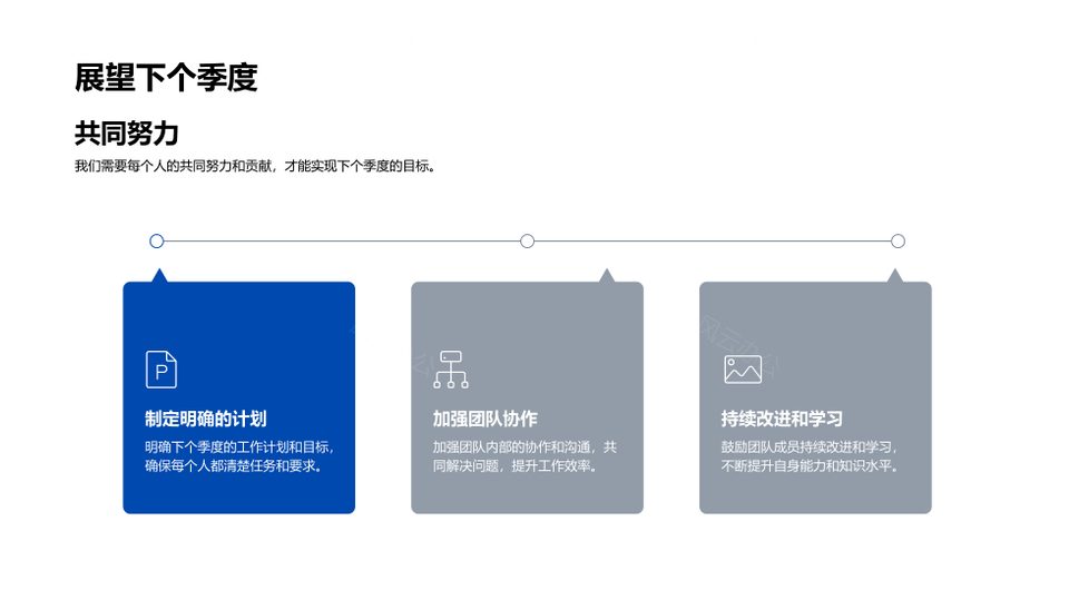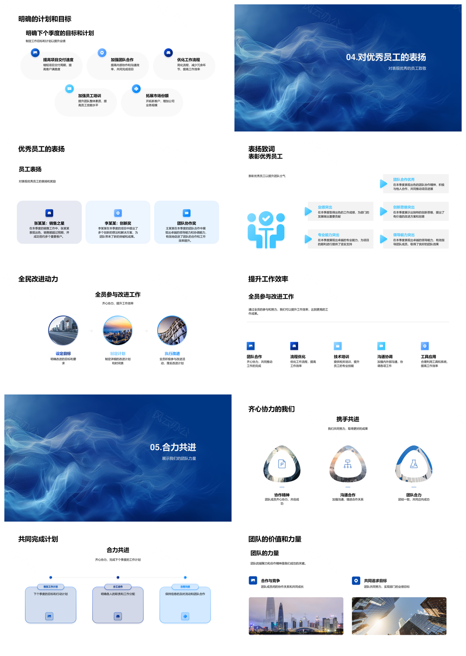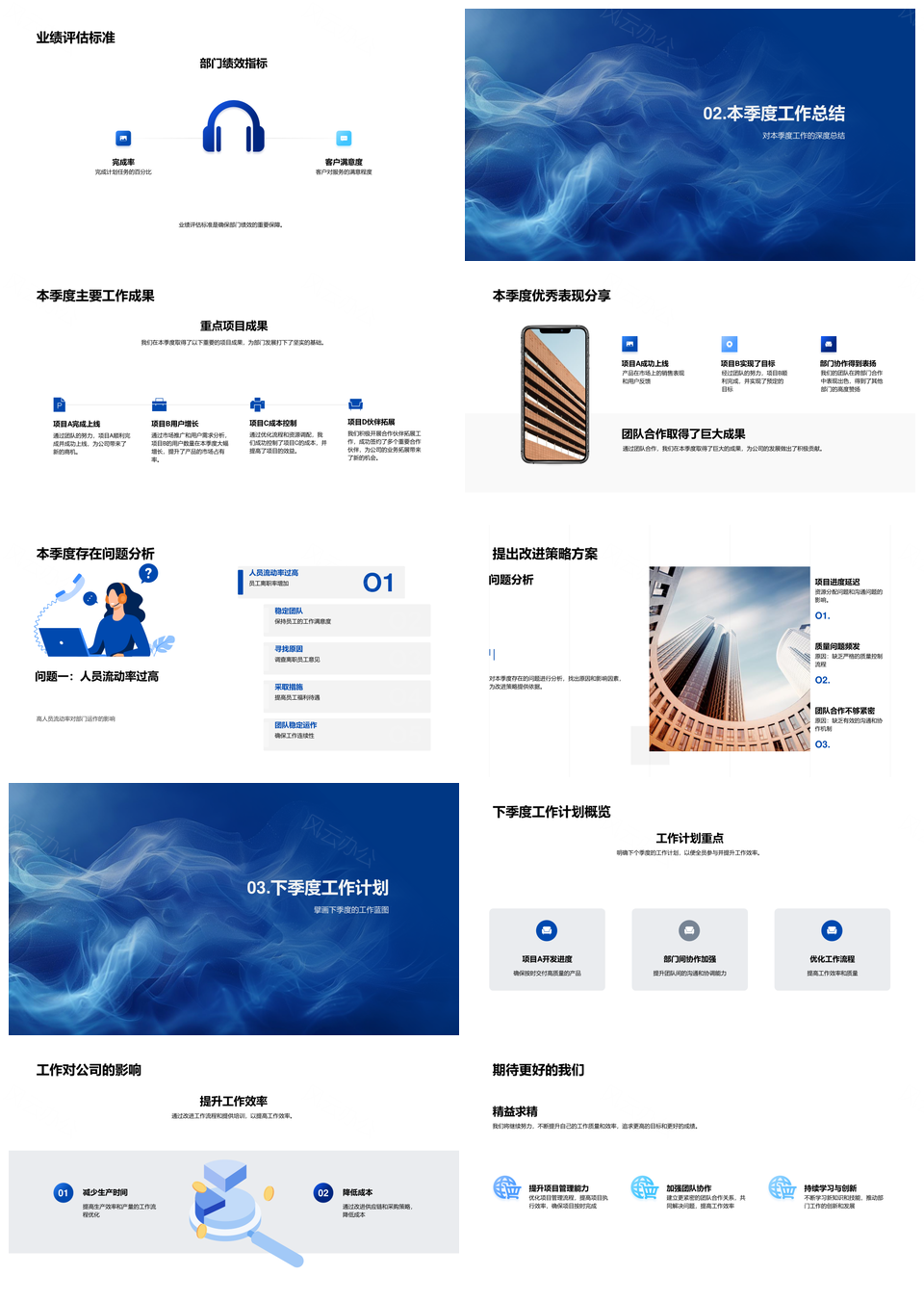 这是一张部门季度业绩总结目标项目成果评估改进计划PPT模板,包含部门、季度、业绩、总结、目标、项目、成果、评估、改进、计划等主题内容,也可用作部门季度业绩总结、季度业绩总结目标、业绩总结目标项目、总结目标项目成果、目标项目成果评估、项目成果评估改进、成果评估改进计划、部门季度业绩、季度业绩总结、业绩总结目标、总结目标项目、目标项目成果、项目成果评估、成果评估改进、评估改进计划等PPT场景使用。 风云办公提供的部门季度业绩总结目标项目成果评估改进计划PPT模板,下载格式为pptx,一共29页,作品中文字及图均可以修改和编辑,图片更改请在作品中右键图片并更换,文字修改请直接点击文字进行修改。