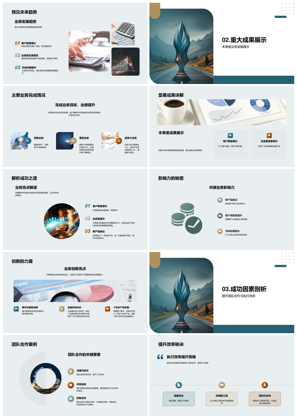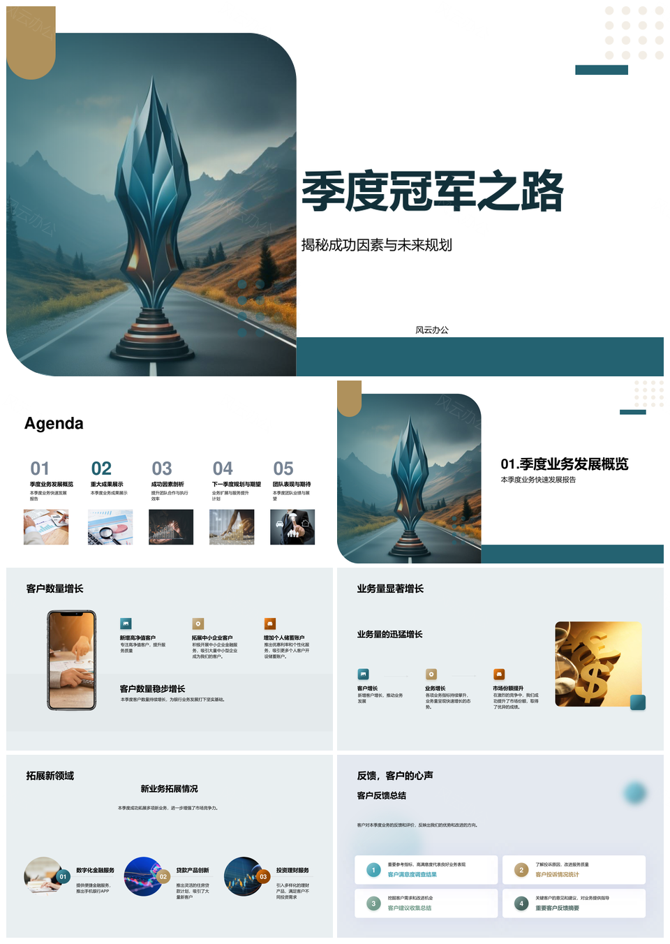 风云办公提供的季度冠军成功拓新业务增长未来路线图PPT模板,下载格式为pptx,一共33页,作品中文字及图均可以修改和编辑,图片更改请在作品中右键图片并更换,文字修改请直接点击文字进行修改。