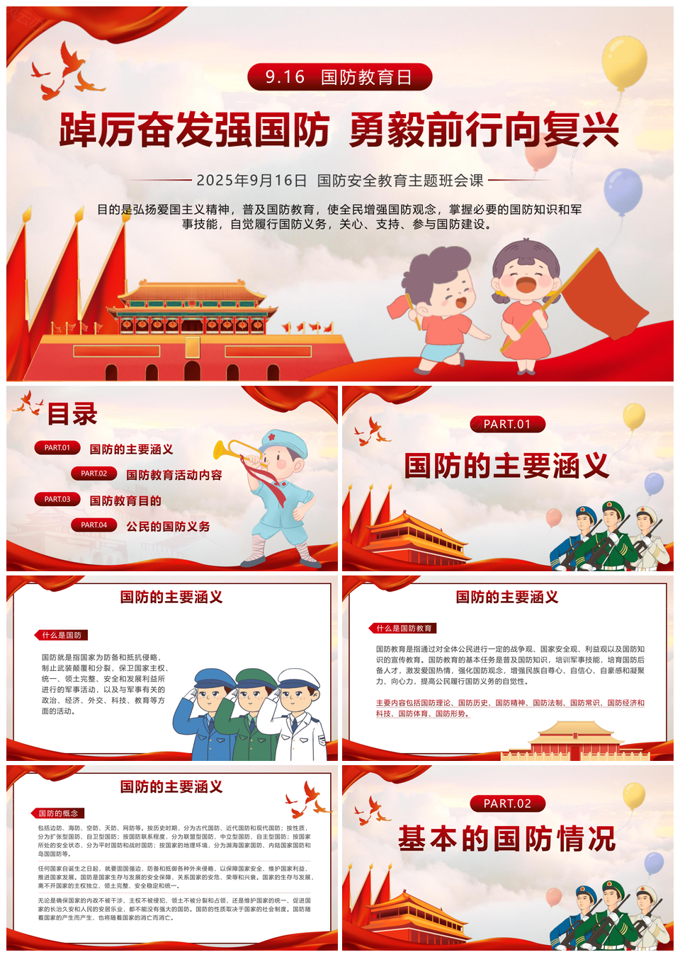这是一张2025党政国防安全教育党课9月16强军复兴PPT模板,包含2025、党政国防、安全教育、党课、9月16、强军复兴等主题内容,也可用作2025党政国防安全教育、党政国防安全教育党课、国防安全教育党课9月16、党课9月16强军复兴、党政国防安全教育、安全教育党课9月16、国防安全教育党课、2025党政国防、党政国防、国防安全教育、安全教育党课、党课9月16、9月16强军、强军复兴、9月16强军复兴等PPT场景使用。 风云办公提供的2025党政国防安全教育党课9月16强军复兴PPT模板,下载格式为pptx,一共19页,作品中文字及图均可以修改和编辑,图片更改请在作品中右键图片并更换,文字修改请直接点击文字进行修改。