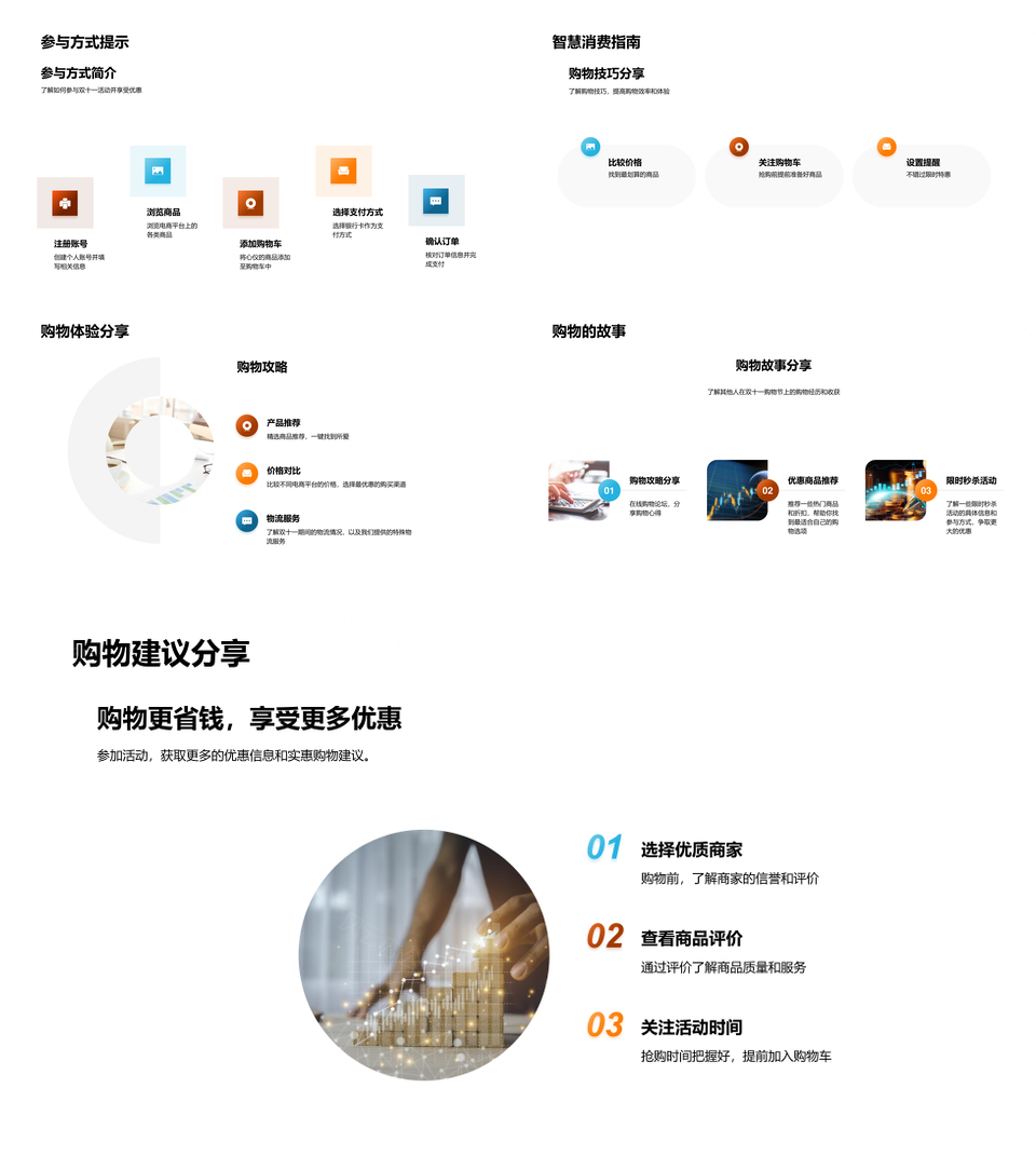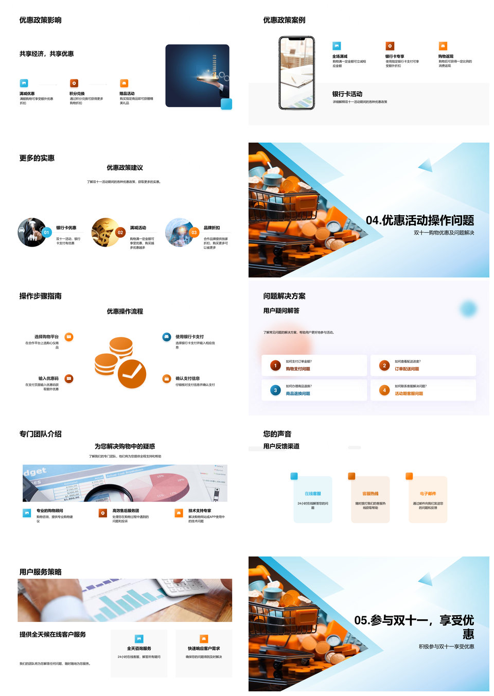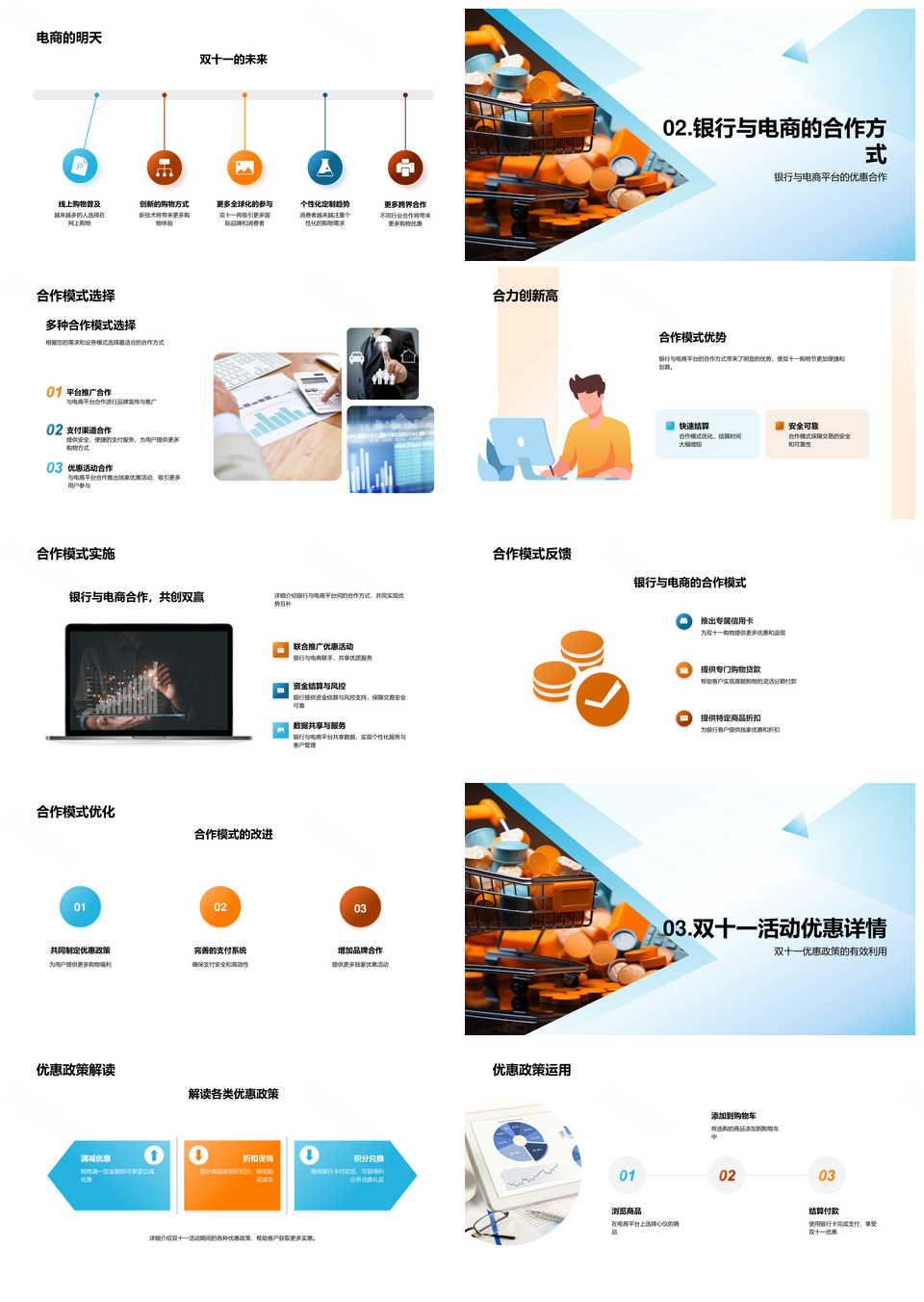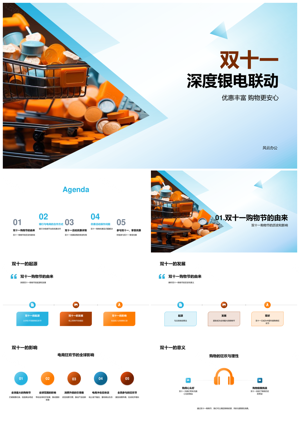 风云办公提供的双十一银电联动卡优惠电商购物节PPT模板,下载格式为pptx,一共33页,作品中文字及图均可以修改和编辑,图片更改请在作品中右键图片并更换,文字修改请直接点击文字进行修改。