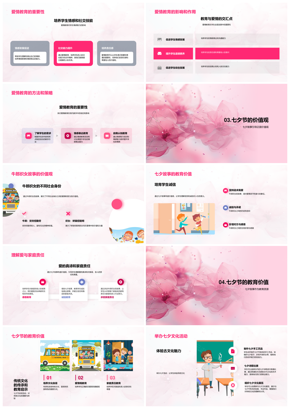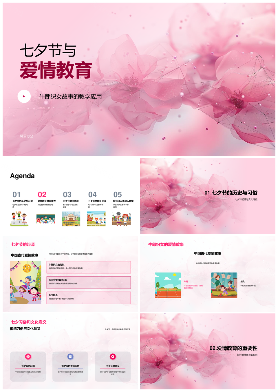 风云办公提供的七夕爱情教育传承牛郎织女教学应用PPT模板,下载格式为pptx,一共23页,作品中文字及图均可以修改和编辑,图片更改请在作品中右键图片并更换,文字修改请直接点击文字进行修改。