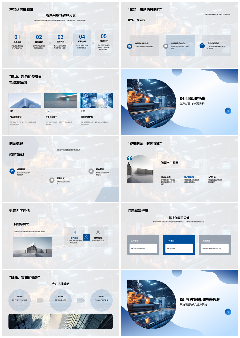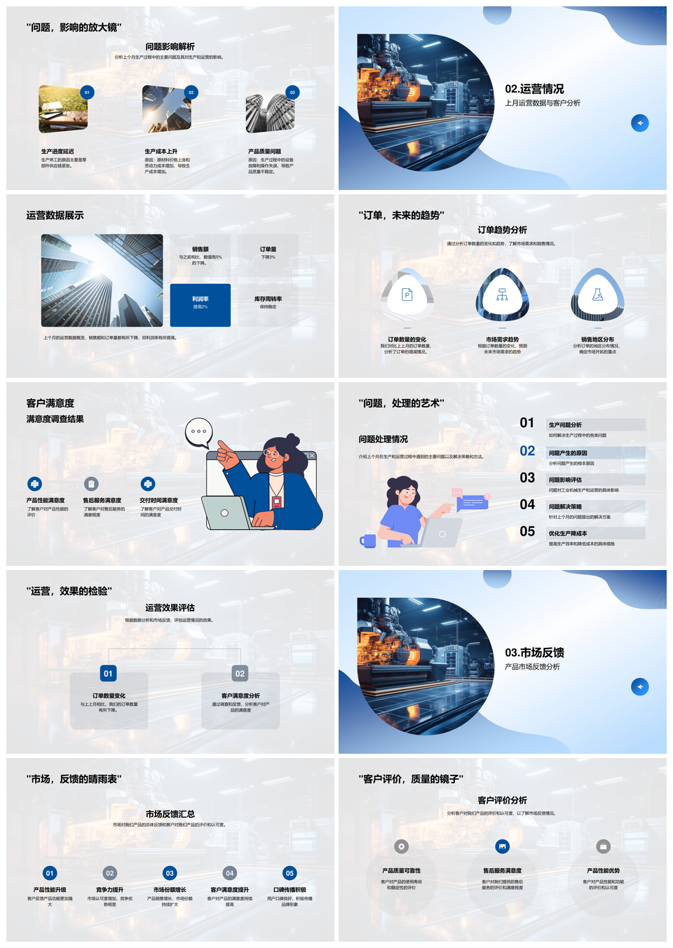 这是一张工业机械生产运营策略与订单客户满意度分析PPT模板,包含工业、机械、生产、运营、策略、订单、客户、满意度、分析等主题内容,也可用作工业机械生产运营策略分析、工业机械生产运营策略、生产运营策略分析、订单客户满意度分析、工业机械策略分析、工业机械订单客户满意度、策略订单客户满意度分析、生产运营订单客户满意度分析、工业机械生产运营、生产运营策略、订单客户满意度、满意度分析、工业机械策略、生产运营分析、订单客户分析等PPT场景使用。 风云办公提供的工业机械生产运营策略与订单客户满意度分析PPT模板,下载格式为pptx,一共33页,作品中文字及图均可以修改和编辑,图片更改请在作品中右键图片并更换,文字修改请直接点击文字进行修改。