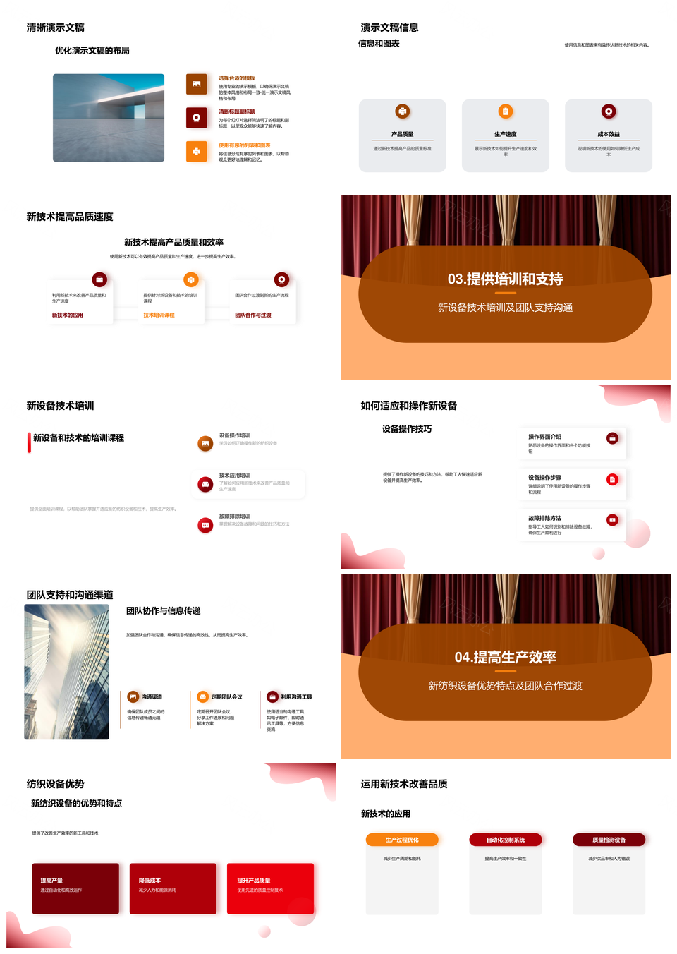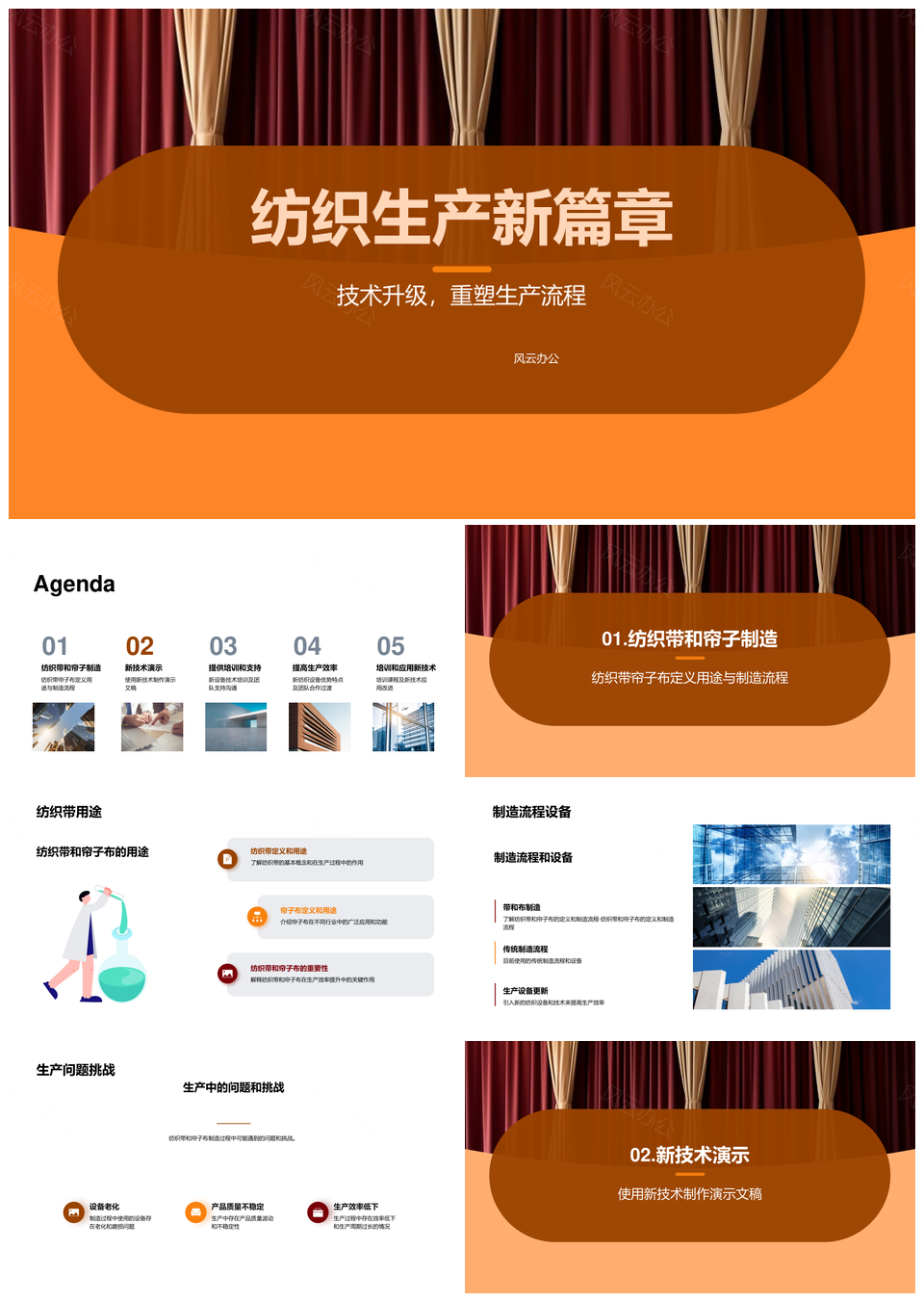 这是一张纺织带帘子布制造流程设备挑战新技术提效PPT模板,包含纺织带、帘子布、制造流程、设备、挑战、新技术、提效等主题内容,也可用作纺织带帘子布制造流程设备挑战新技术提效、纺织带帘子布制造流程设备、帘子布制造流程设备挑战、制造流程设备挑战新技术、设备挑战新技术提效、纺织带帘子布制造流程、帘子布制造流程设备、制造流程设备挑战、设备挑战新技术、挑战新技术提效、纺织带帘子布、帘子布制造流程、制造流程设备、设备挑战、挑战新技术、新技术提效等PPT场景使用。 风云办公提供的纺织带帘子布制造流程设备挑战新技术提效PPT模板,下载格式为pptx,一共23页,作品中文字及图均可以修改和编辑,图片更改请在作品中右键图片并更换,文字修改请直接点击文字进行修改。