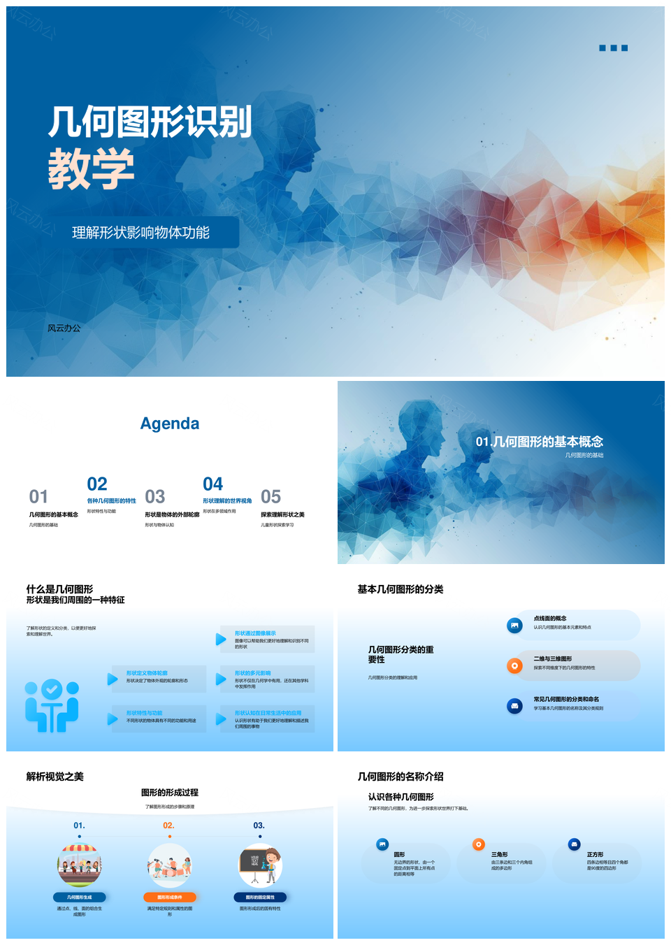 风云办公提供的幼儿几何图形识别与形状功能教学PPT模板,下载格式为pptx,一共33页,作品中文字及图均可以修改和编辑,图片更改请在作品中右键图片并更换,文字修改请直接点击文字进行修改。