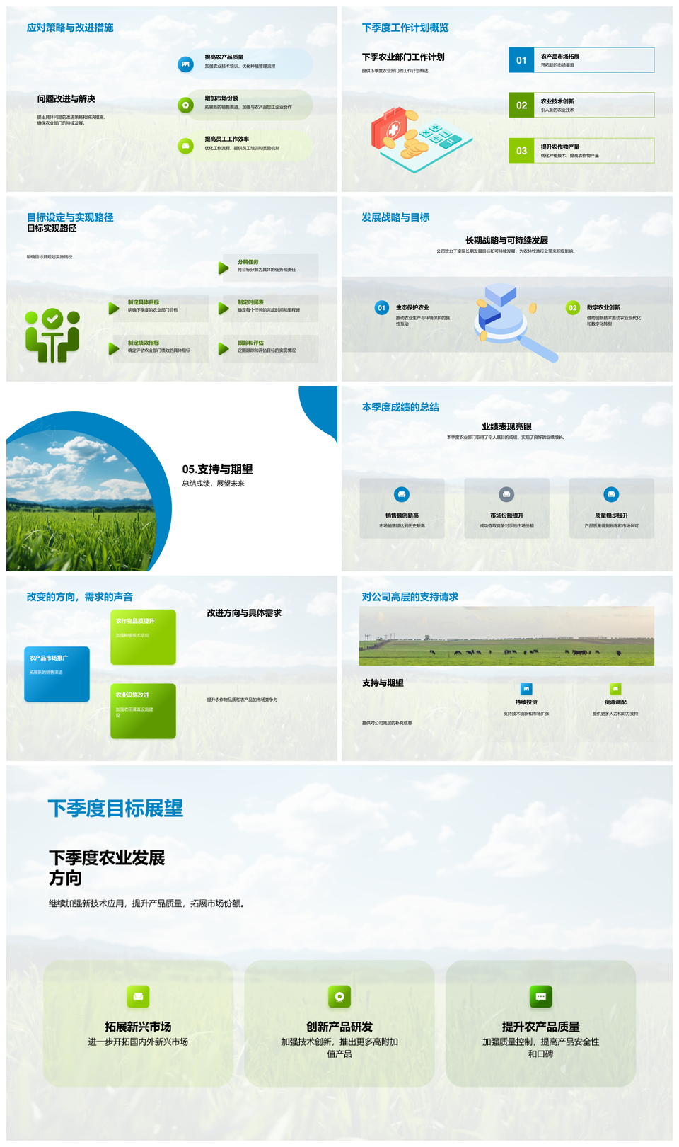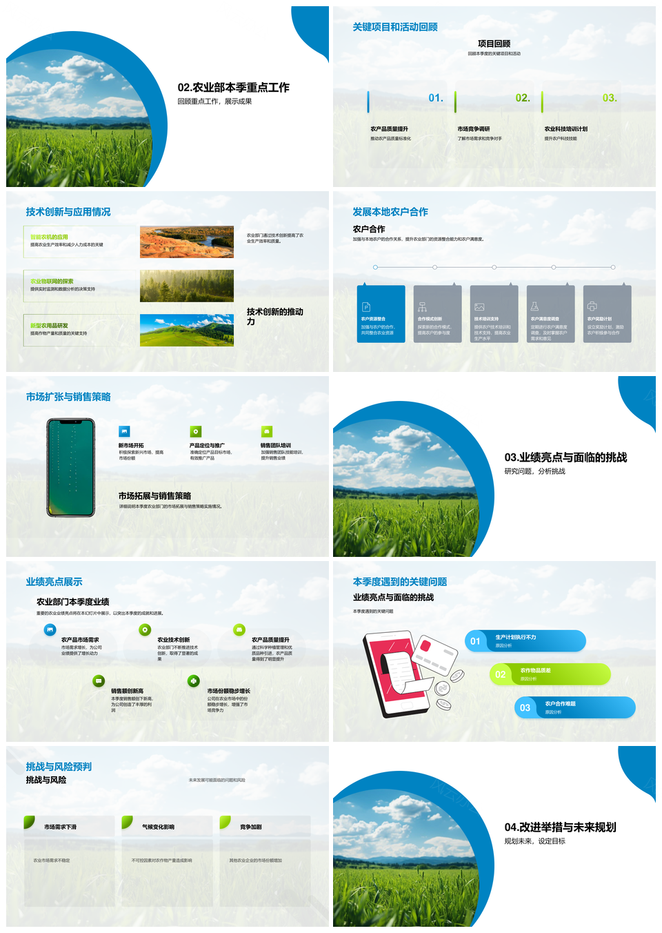 这是一张农业季度盘点总结规划人力技术合作市场趋势PPT模板,包含农业、季度、盘点、总结、规划、人力、技术、合作、市场、趋势等主题内容,也可用作农业季度盘点总结规划、季度盘点总结规划人力、人力技术合作市场趋势、农业季度技术合作、季度总结规划人力技术、盘点总结规划技术、技术合作市场趋势总结、农业人力技术合作、规划人力技术合作、技术合作市场趋势、农业季度盘点规划、季度盘点总结规划、总结规划人力技术、人力技术合作、农业市场趋势 解析过程: 1. **词语提取**:原句切分为“农业、季度、盘点、总结、规划、人力、技术、合作、市场趋势”。 2. **最长短语优先**:优先组合4词短语、如“农业季度盘点总结规划”;再逐步减少词数。 3. **语义通顺约束**:排除不通顺组合(如“农业季度人力技术”);保留合理搭配(如“人力技术合作市场趋势”)。 4. **截断至15条**:按组合逻辑和词数降序排列、取前15条有效短语。等PPT场景使用。 风云办公提供的农业季度盘点总结规划人力技术合作市场趋势PPT模板,下载格式为pptx,一共27页,作品中文字及图均可以修改和编辑,图片更改请在作品中右键图片并更换,文字修改请直接点击文字进行修改。