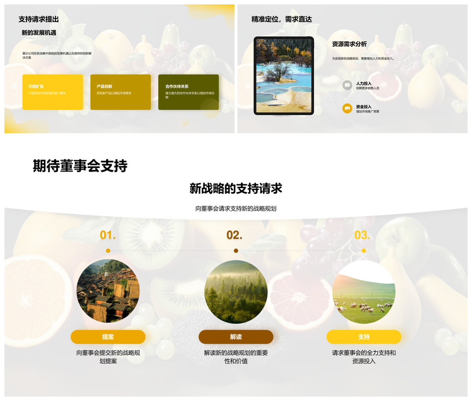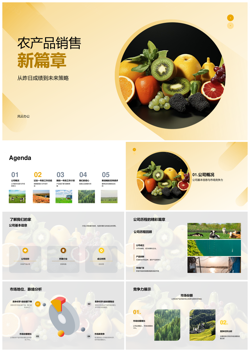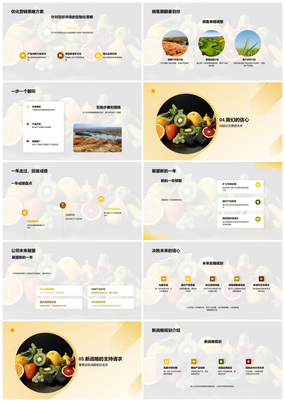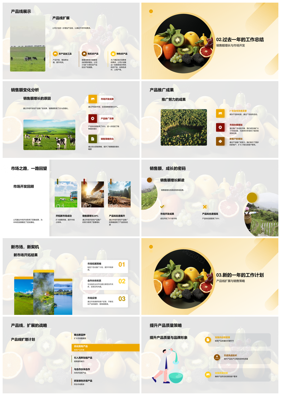 这是一张农产品销售增长开拓新市场扩展果蔬产品线PPT模板,包含农产品、销售增长、开拓、新市场、扩展、果蔬、产品线等主题内容,也可用作农产品销售增长开拓、销售增长开拓新市场、增长开拓新市场扩展、开拓新市场扩展果蔬、新市场扩展果蔬产品线、农产品销售增长、销售增长开拓、增长开拓新市场、开拓新市场扩展、新市场扩展果蔬、扩展果蔬产品线、开拓新市场、扩展果蔬、果蔬产品线、销售增长等PPT场景使用。 风云办公提供的农产品销售增长开拓新市场扩展果蔬产品线PPT模板,下载格式为pptx,一共31页,作品中文字及图均可以修改和编辑,图片更改请在作品中右键图片并更换,文字修改请直接点击文字进行修改。
