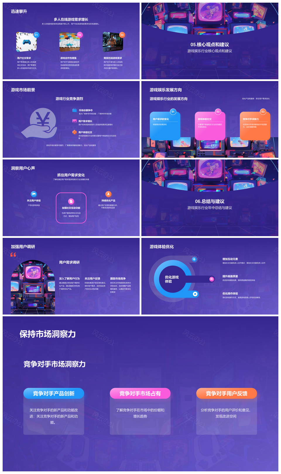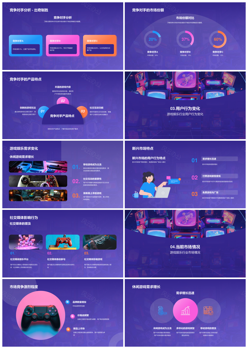游戏娱乐年终总结市场规模趋势新技术竞争紫色插画PPT模板