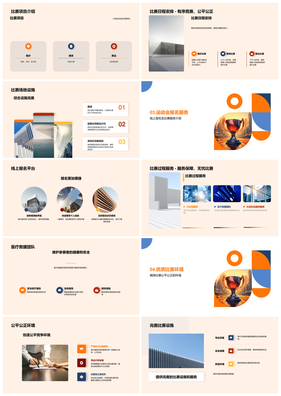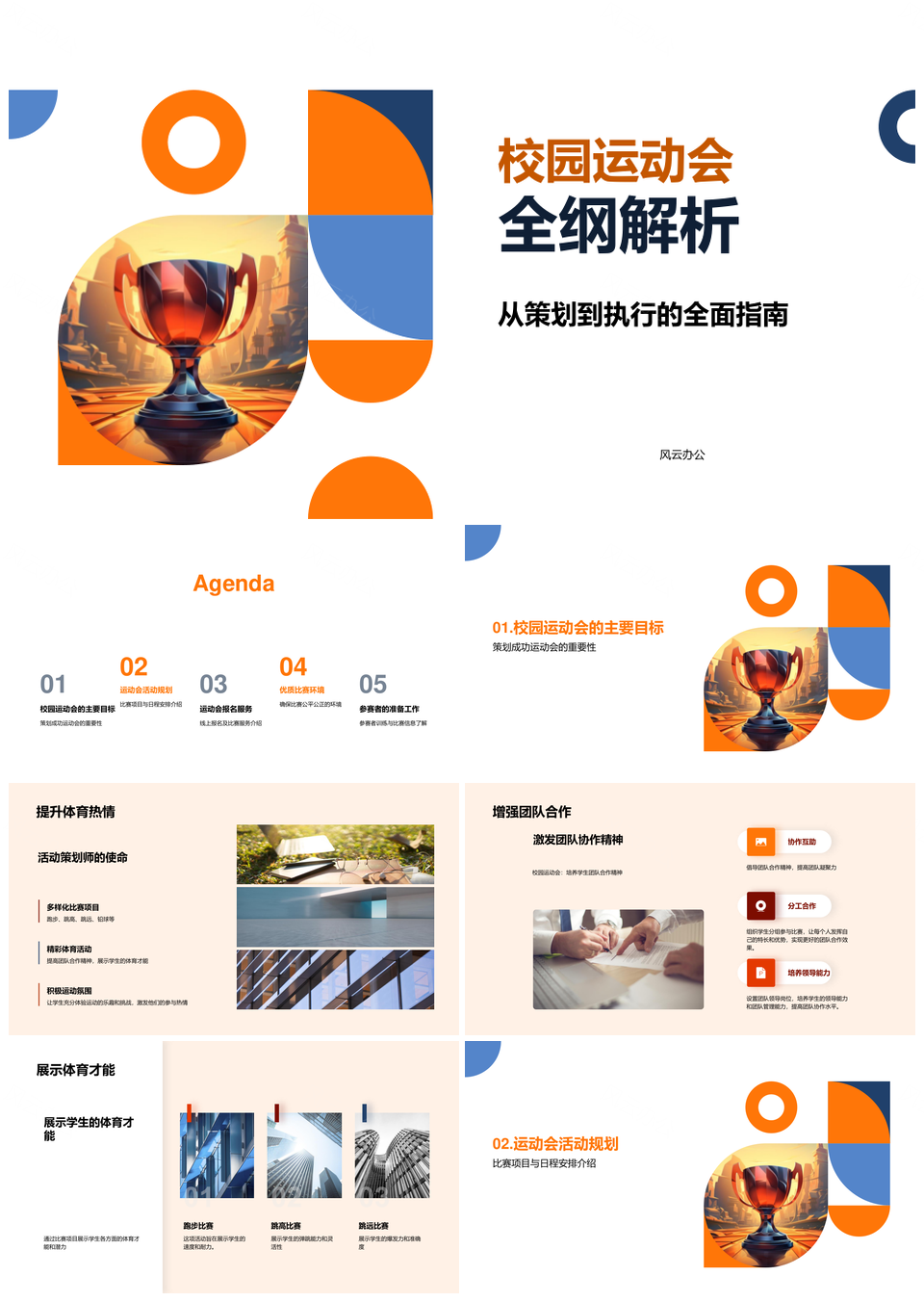 风云办公提供的校园运动会策划执行赛程场地全解析PPT模板,下载格式为pptx,一共23页,作品中文字及图均可以修改和编辑,图片更改请在作品中右键图片并更换,文字修改请直接点击文字进行修改。