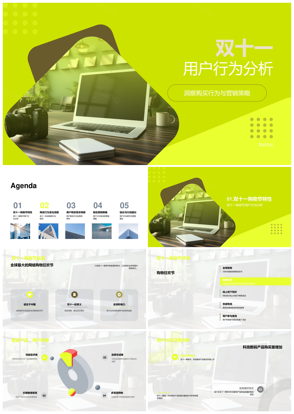 风云办公提供的双十一科技数码用户消费行为研究PPT模板,下载格式为pptx,一共33页,作品中文字及图均可以修改和编辑,图片更改请在作品中右键图片并更换,文字修改请直接点击文字进行修改。