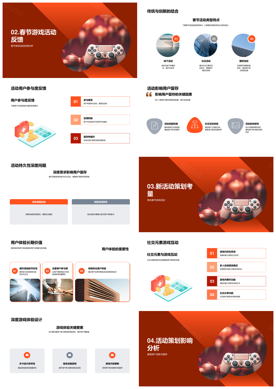 这是一张春节游戏策划用户行为研究与活动优化提升活跃留存灯笼PPT模板,包含春节、游戏策划、用户行为研究、活动优化、提升、活跃、留存、灯笼等主题内容,也可用作春节游戏策划用户行为研究活动优化、用户行为研究活动优化提升活跃、活动优化提升活跃留存灯笼、春节游戏策划活动优化提升留存、游戏策划用户行为研究活动优化、用户行为研究活动优化提升留存、活动优化提升活跃留存灯笼、春节活动优化提升活跃留存、游戏策划活动优化提升活跃、用户行为研究提升活跃留存、春节游戏策划提升活跃留存、活动优化提升留存灯笼、游戏策划用户行为研究提升、春节活动优化留存灯笼、用户行为研究活跃留存灯笼等PPT场景使用。 风云办公提供的春节游戏策划用户行为研究与活动优化提升活跃留存灯笼PPT模板,下载格式为pptx,一共25页,作品中文字及图均可以修改和编辑,图片更改请在作品中右键图片并更换,文字修改请直接点击文字进行修改。
