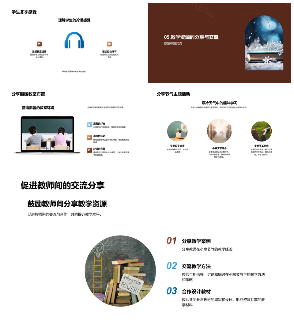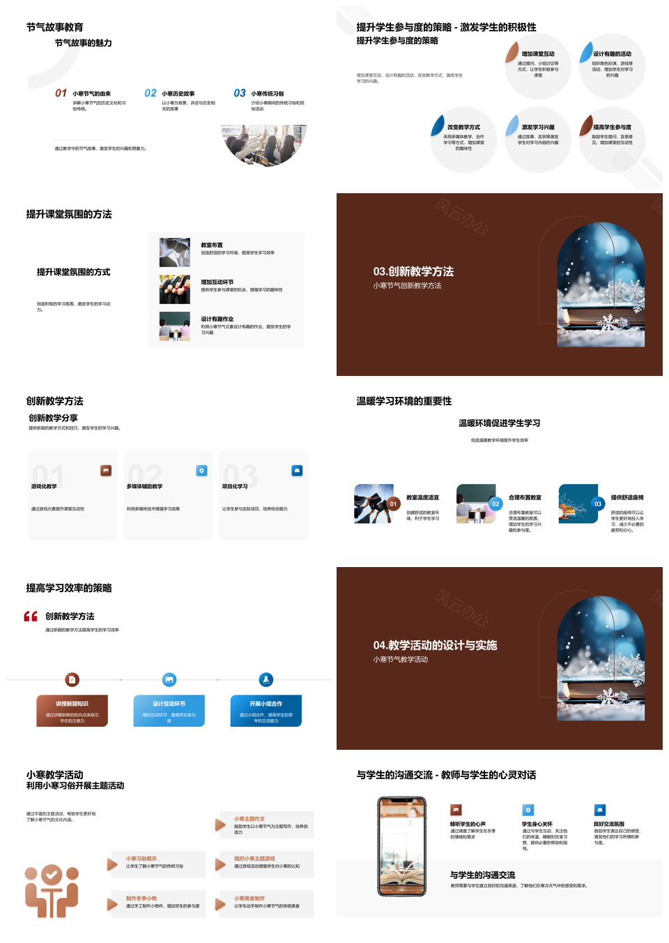 这是一张小寒创新教学提升节气文化参与度PPT模板,包含小寒、创新教学、提升、节气文化、参与度等主题内容,也可用作提升节气文化参与度、小寒创新教学、创新教学提升、提升节气文化、节气文化参与度、小寒创新、创新教学、教学提升、提升节气、节气文化、文化参与度、创新提升、提升文化、提升参与度、小寒节气等PPT场景使用。 风云办公提供的小寒创新教学提升节气文化参与度PPT模板,下载格式为pptx,一共23页,作品中文字及图均可以修改和编辑,图片更改请在作品中右键图片并更换,文字修改请直接点击文字进行修改。