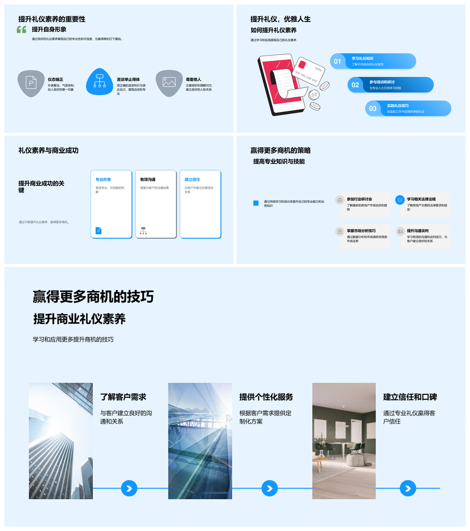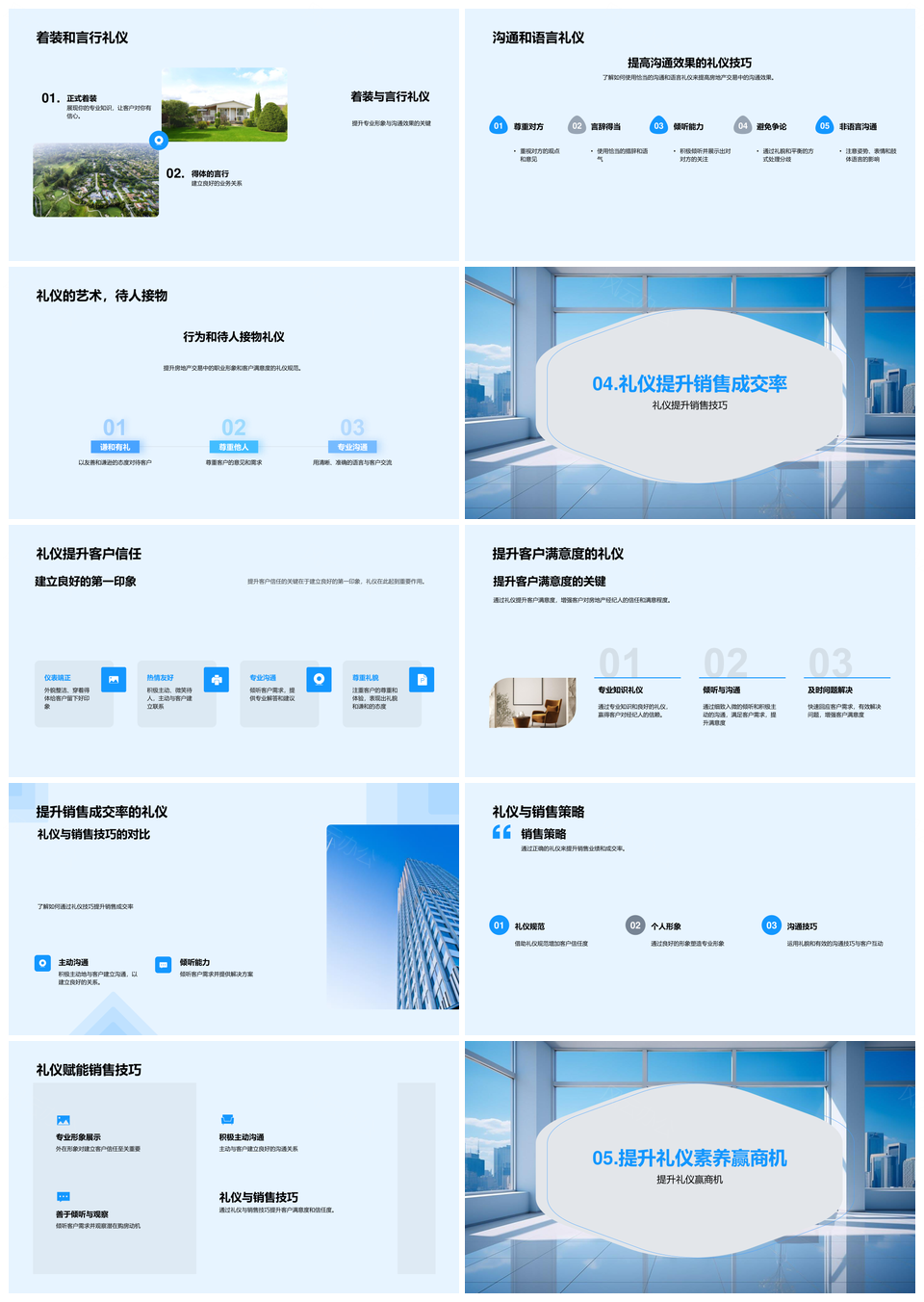 这是一张房地产商务礼仪增效销售流程提升客户满意建筑成交艺术PPT模板,包含房地产、商务礼仪、增效、销售流程、提升、客户满意、建筑、成交艺术等主题内容,也可用作房地产商务礼仪增效销售流程、商务礼仪增效销售流程提升、增效销售流程提升客户满意、销售流程提升客户满意建筑成交、提升客户满意建筑成交艺术、房地产商务礼仪增效、商务礼仪增效销售流程、增效销售流程提升、销售流程提升客户满意、提升客户满意建筑成交、客户满意建筑成交艺术、房地产商务礼仪、商务礼仪增效、增效销售流程、销售流程提升等PPT场景使用。 风云办公提供的房地产商务礼仪增效销售流程提升客户满意建筑成交艺术PPT模板,下载格式为pptx,一共33页,作品中文字及图均可以修改和编辑,图片更改请在作品中右键图片并更换,文字修改请直接点击文字进行修改。