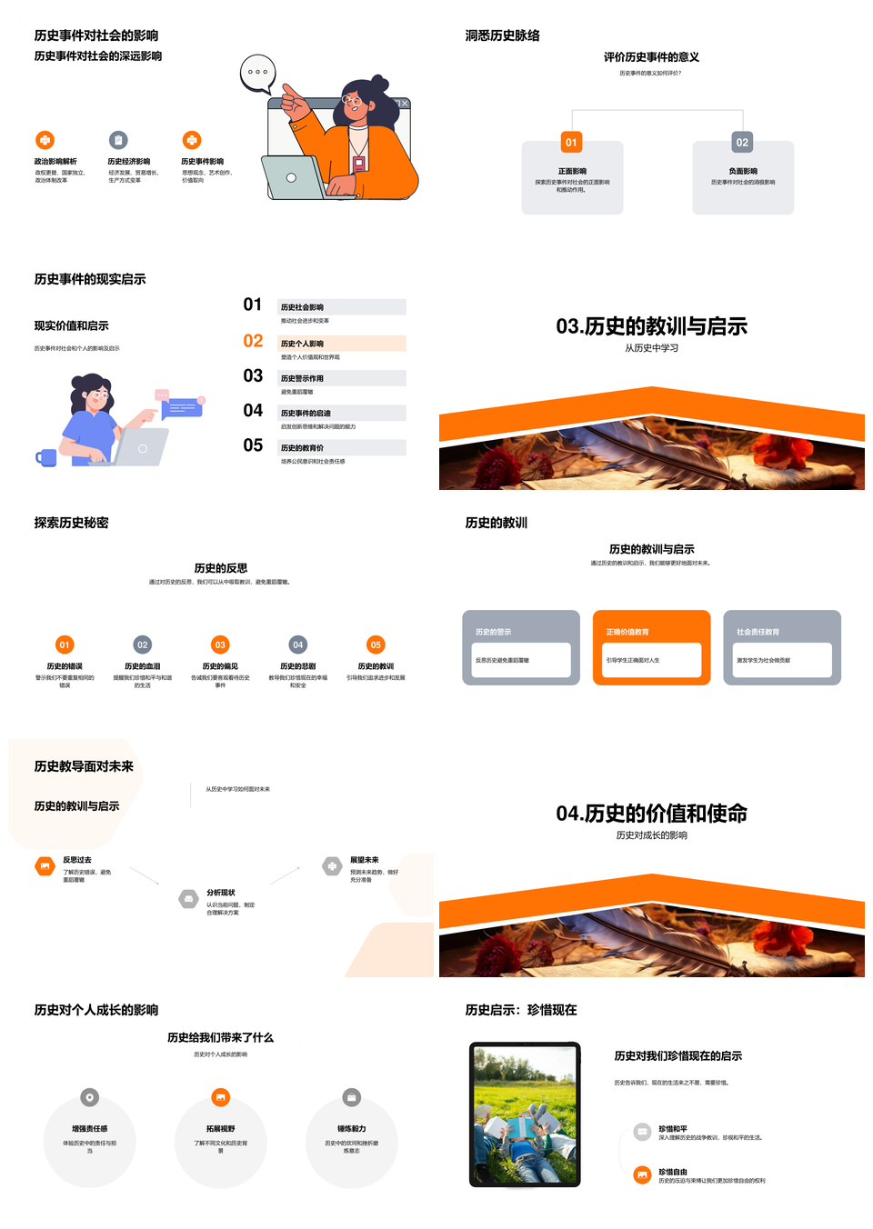 风云办公提供的历史教育鉴往知来塑生活价值观PPT模板,下载格式为pptx,一共23页,作品中文字及图均可以修改和编辑,图片更改请在作品中右键图片并更换,文字修改请直接点击文字进行修改。