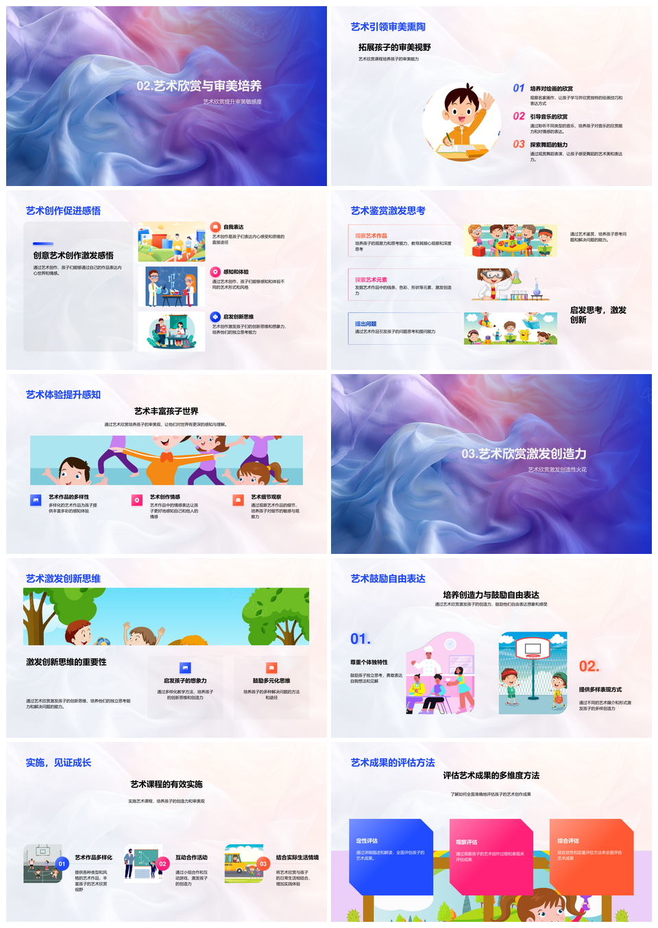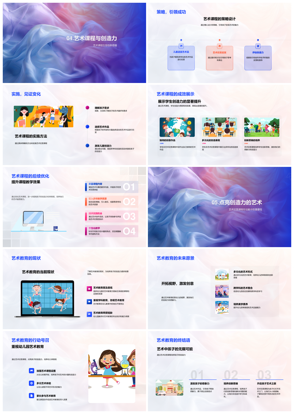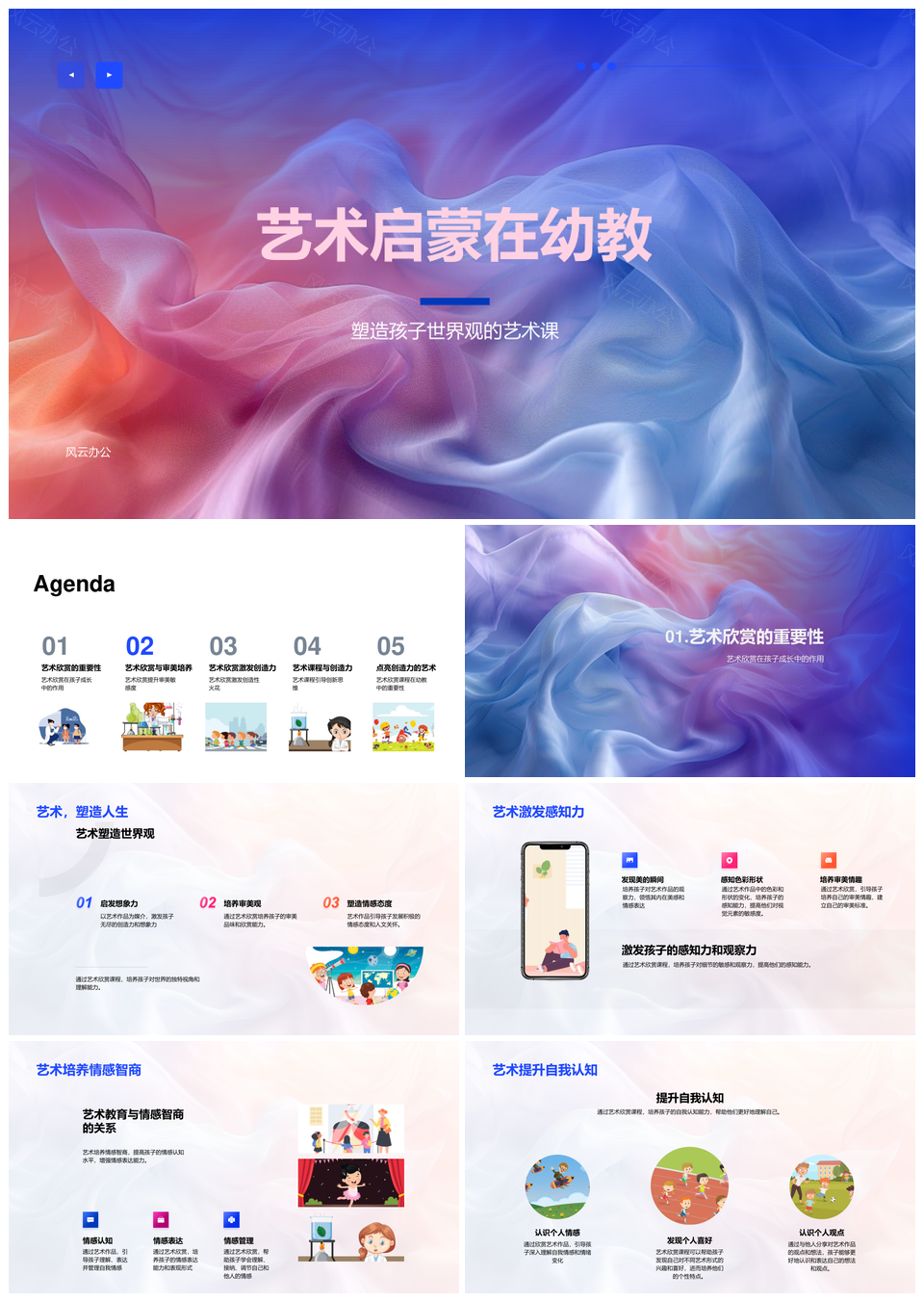 风云办公提供的幼教艺术启蒙课培养创造力与审美观PPT模板,下载格式为pptx,一共28页,作品中文字及图均可以修改和编辑,图片更改请在作品中右键图片并更换,文字修改请直接点击文字进行修改。