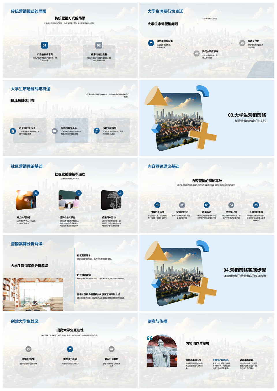 风云办公提供的大学生社区内容营销创新策略分析PPT模板,下载格式为pptx,一共23页,作品中文字及图均可以修改和编辑,图片更改请在作品中右键图片并更换,文字修改请直接点击文字进行修改。