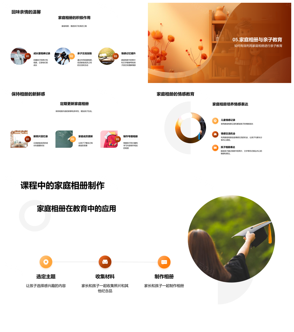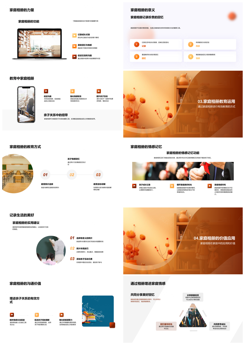 这是一张家庭相册情感记忆助力亲子教育关系构建PPT模板,包含家庭相册、情感记忆、助力、亲子教育、关系构建等主题内容,也可用作家庭相册情感记忆、相册情感记忆助力、情感记忆助力亲子、记忆助力亲子教育、助力亲子教育关系、亲子教育关系构建、家庭相册情感、相册情感记忆、情感记忆助力、记忆助力亲子、助力亲子教育、亲子教育关系、教育关系构建、家庭相册、情感记忆等PPT场景使用。 风云办公提供的家庭相册情感记忆助力亲子教育关系构建PPT模板,下载格式为pptx,一共23页,作品中文字及图均可以修改和编辑,图片更改请在作品中右键图片并更换,文字修改请直接点击文字进行修改。