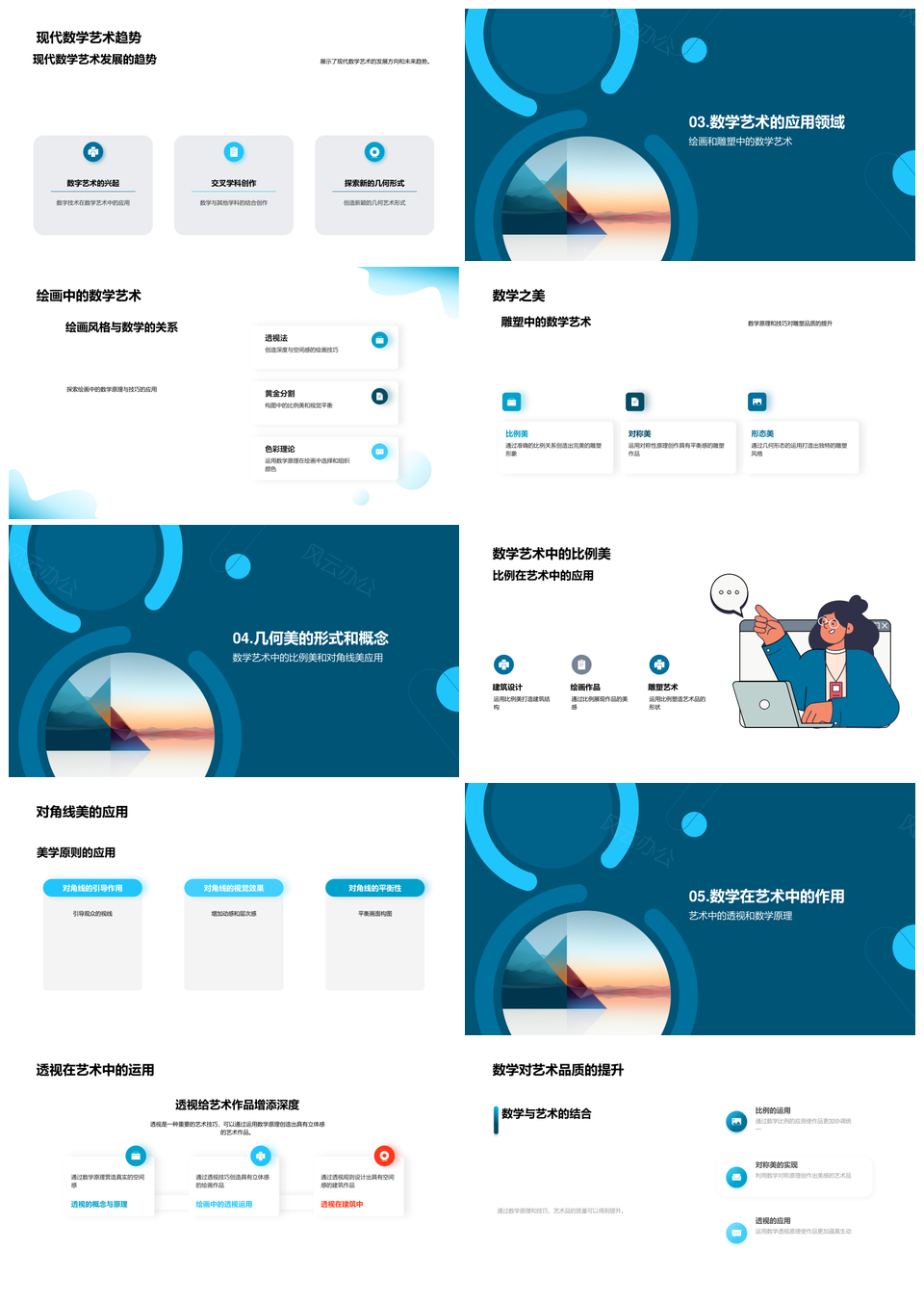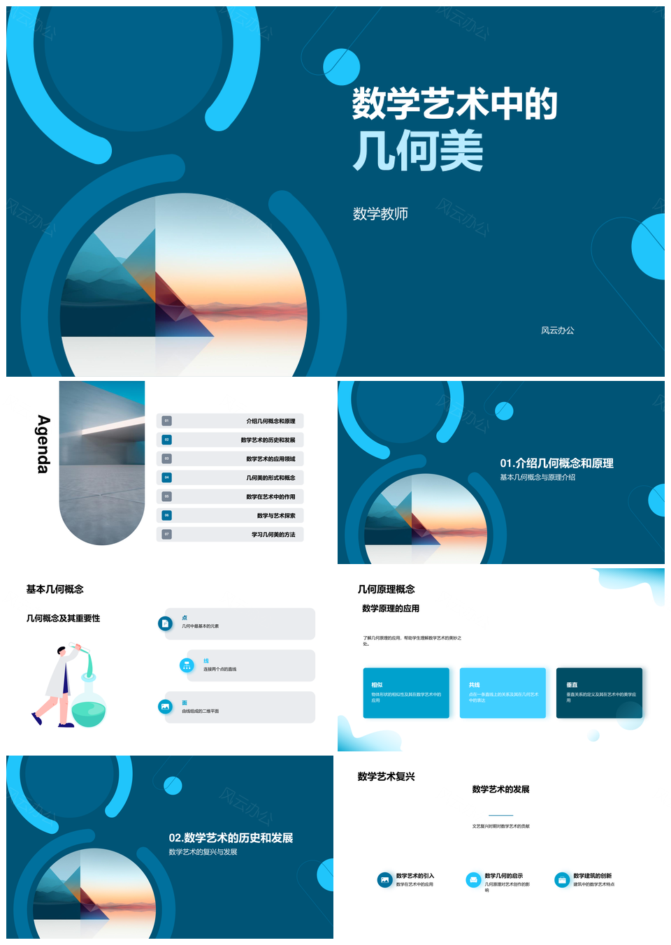 风云办公提供的数学艺术几何美教师课程点线概念PPT模板,下载格式为pptx,一共24页,作品中文字及图均可以修改和编辑,图片更改请在作品中右键图片并更换,文字修改请直接点击文字进行修改。