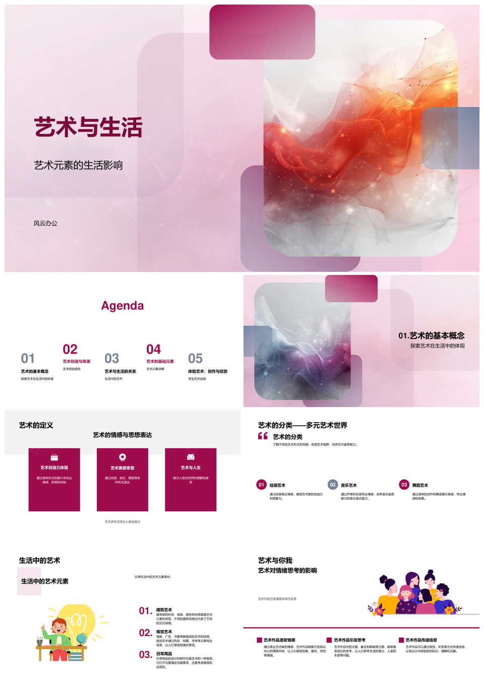 这是一张艺术与生活定义分类创造性审美影响元素PPT模板,包含艺术、生活、定义、分类、创造性、审美、影响、元素等主题内容,也可用作艺术生活定义分类、艺术生活创造性审美、创造性审美影响元素、艺术定义分类影响、生活分类创造性元素、分类创造性审美影响、艺术创造性审美影响、生活审美影响元素、定义分类创造性、分类创造性审美、创造性审美影响、艺术生活创造性、审美影响元素、艺术生活、定义分类等PPT场景使用。 风云办公提供的艺术与生活定义分类创造性审美影响元素PPT模板,下载格式为pptx,一共33页,作品中文字及图均可以修改和编辑,图片更改请在作品中右键图片并更换,文字修改请直接点击文字进行修改。