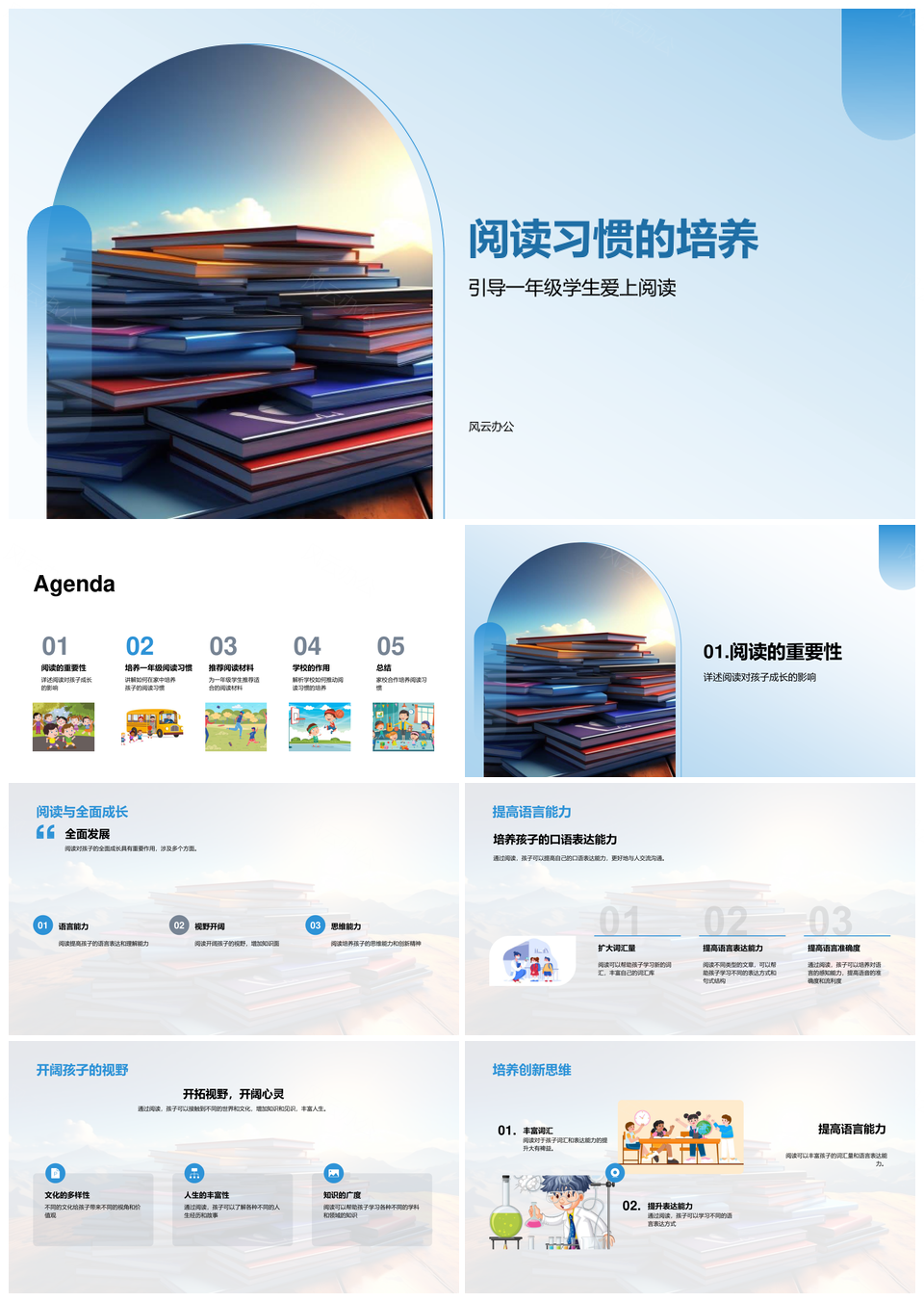 风云办公提供的一年级阅读习惯筑基全面成长PPT模板,下载格式为pptx,一共25页,作品中文字及图均可以修改和编辑,图片更改请在作品中右键图片并更换,文字修改请直接点击文字进行修改。