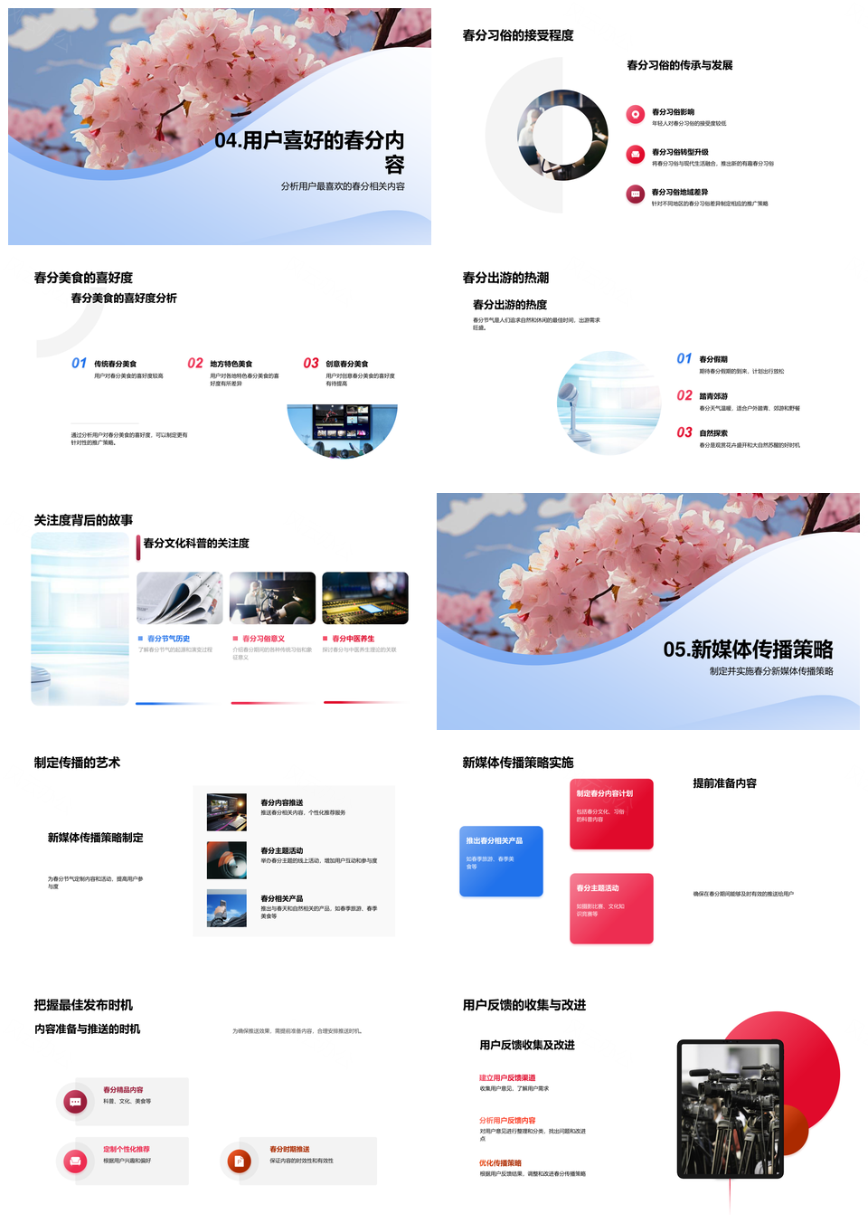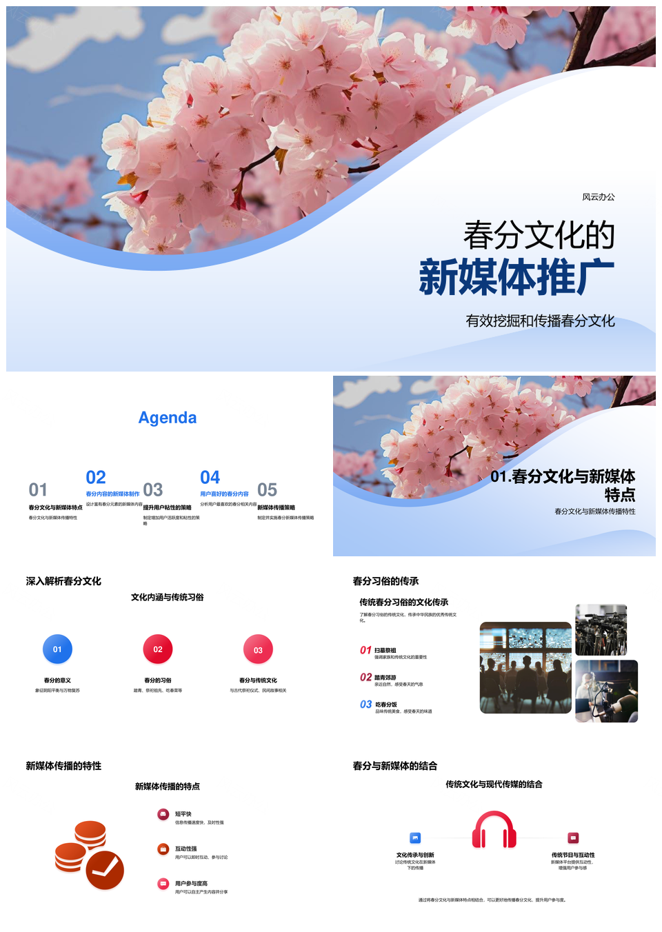 新媒体春分节气文化创新传播社交媒体直播短视频樱花PPT模板