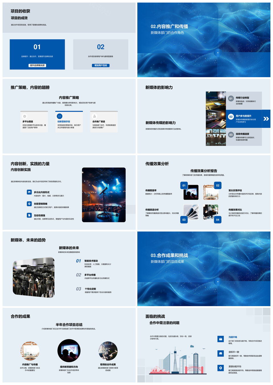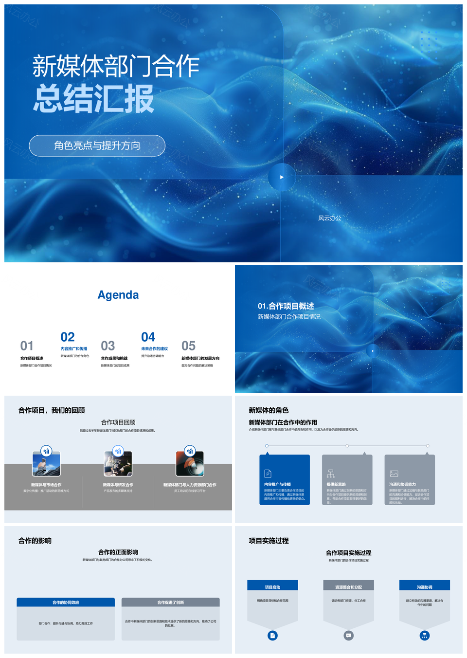 风云办公提供的新媒体部门合作项目成果挑战总结汇报PPT模板,下载格式为pptx,一共33页,作品中文字及图均可以修改和编辑,图片更改请在作品中右键图片并更换,文字修改请直接点击文字进行修改。