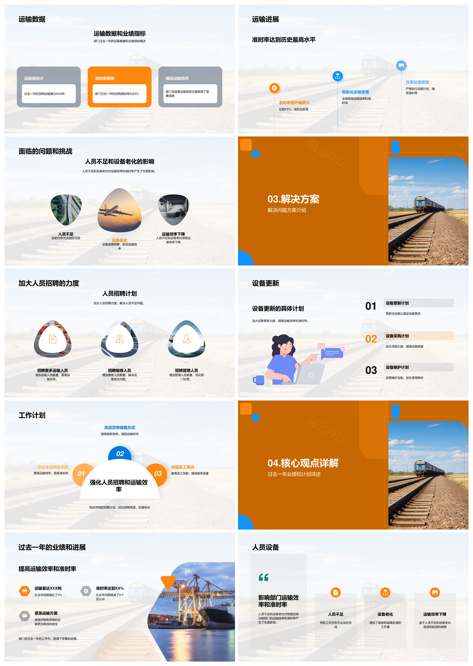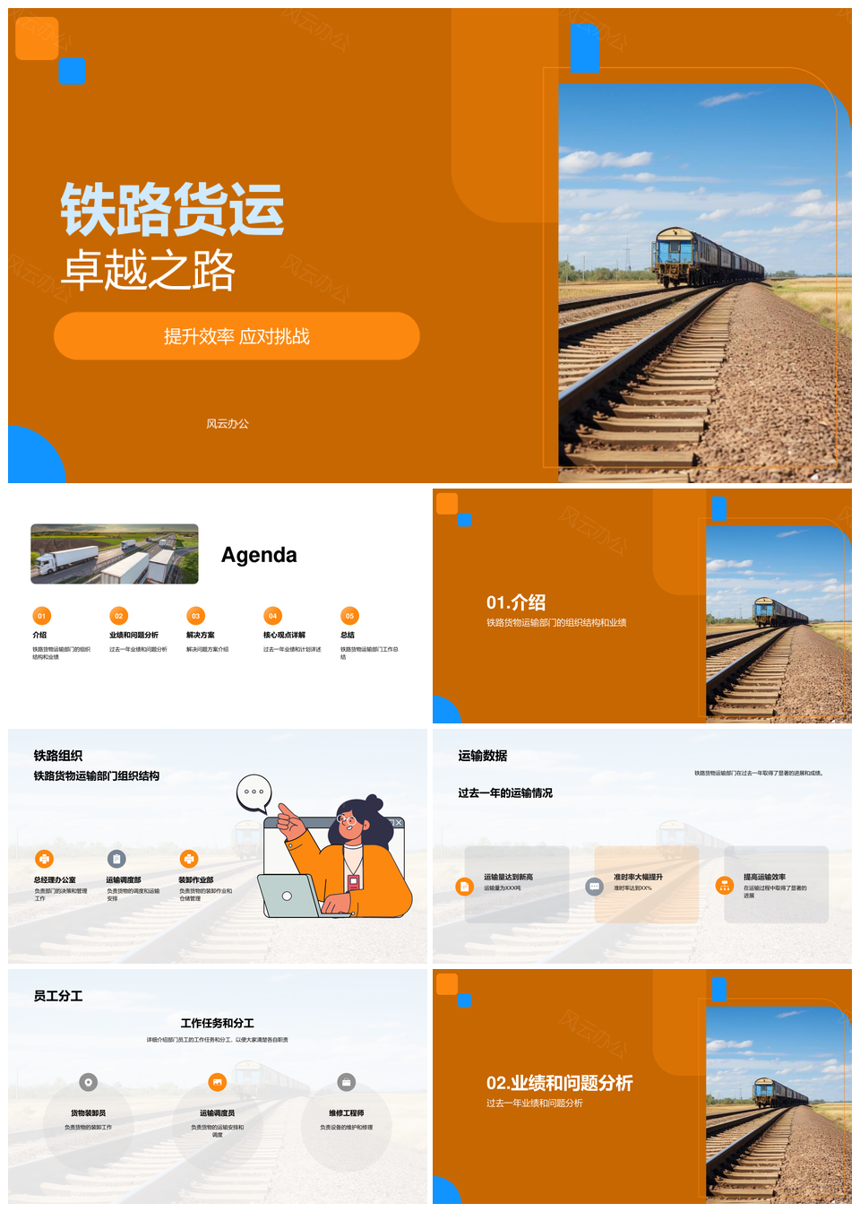 风云办公提供的铁路货运部门总结交通轨道细分应用PPT模板,下载格式为pptx,一共26页,作品中文字及图均可以修改和编辑,图片更改请在作品中右键图片并更换,文字修改请直接点击文字进行修改。