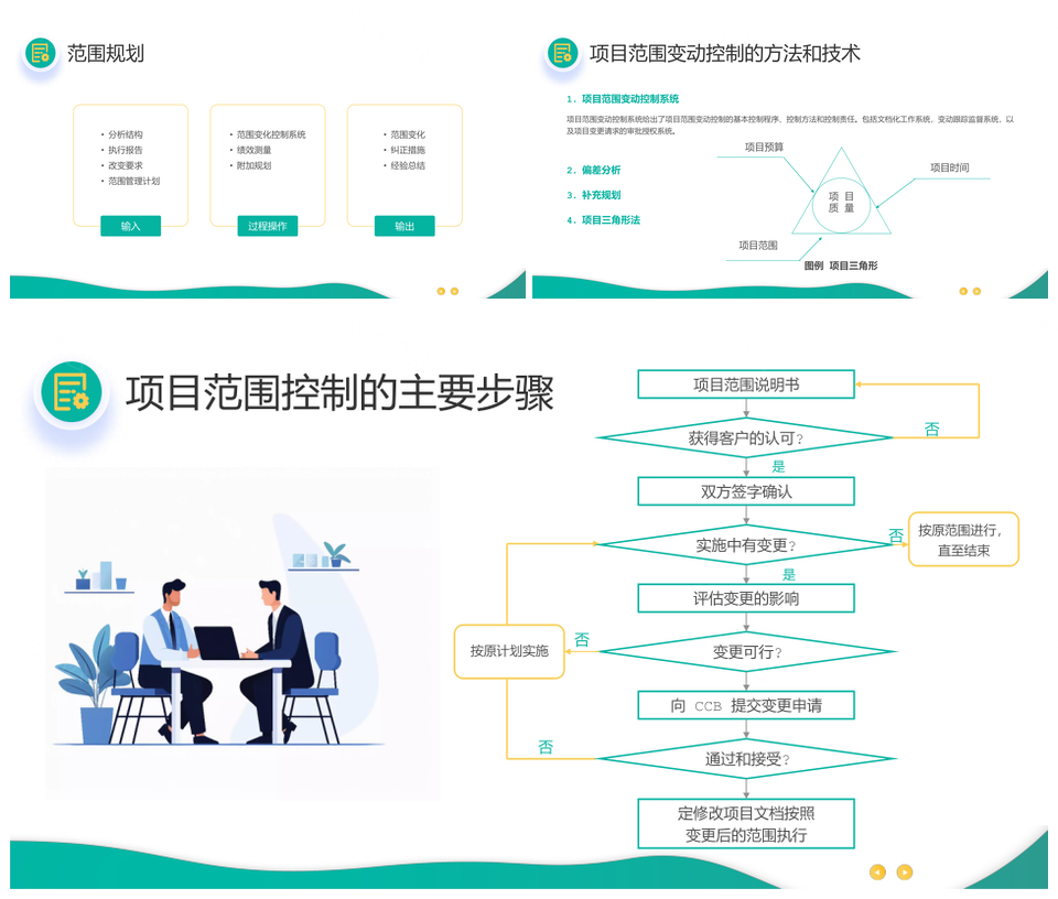 风云办公提供的简约插画商务项目范围管理PMP培训课件,下载格式为pptx,一共41页,作品中文字及图均可以修改和编辑,图片更改请在作品中右键图片并更换,文字修改请直接点击文字进行修改。