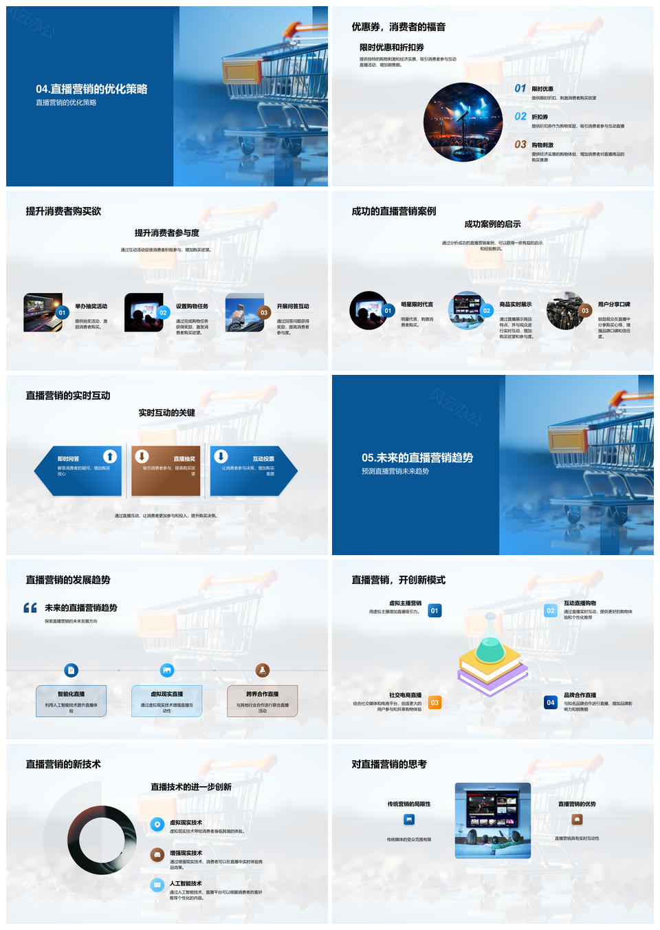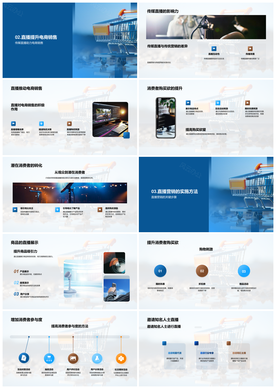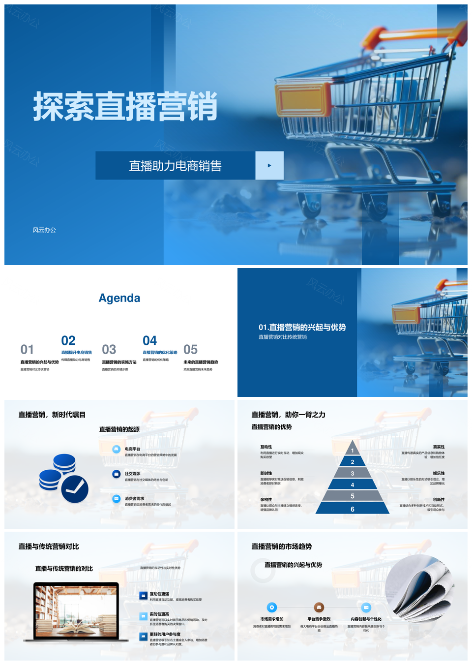 风云办公提供的直播营销策划驱动电商销售转化提升PPT模板,下载格式为pptx,一共28页,作品中文字及图均可以修改和编辑,图片更改请在作品中右键图片并更换,文字修改请直接点击文字进行修改。