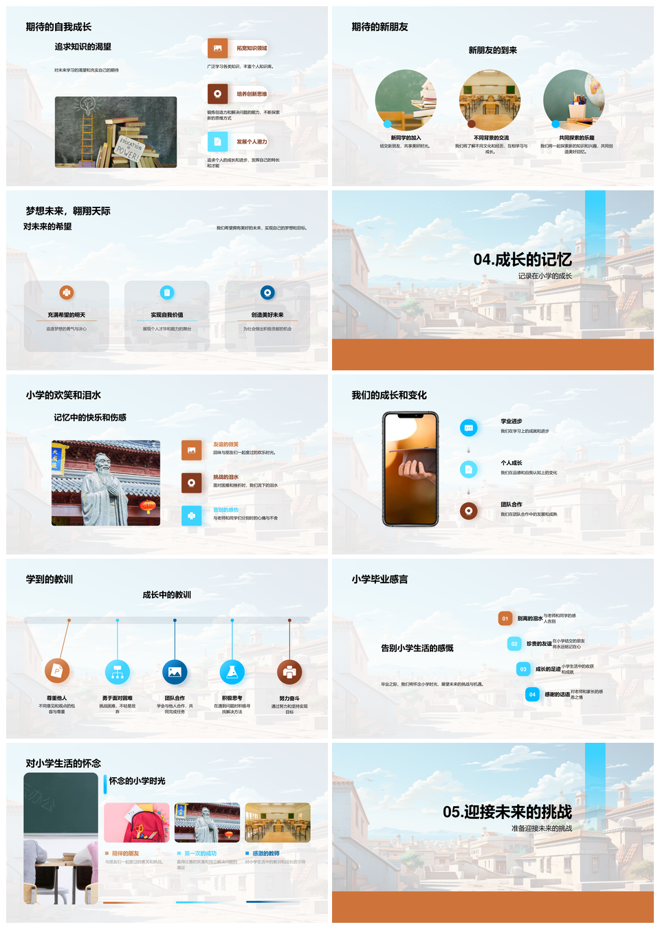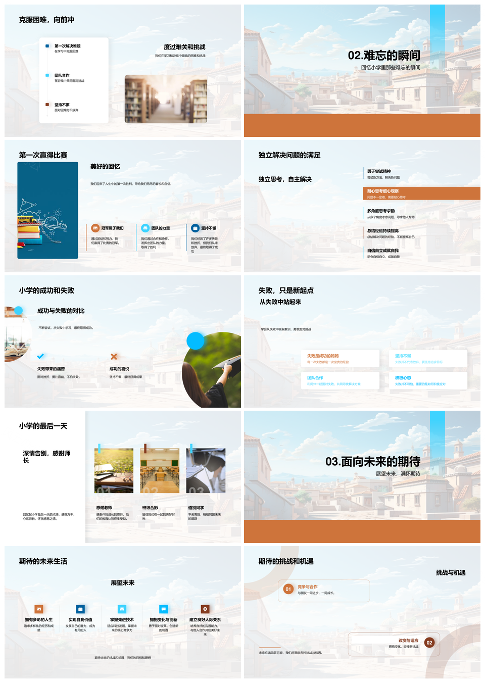 这是一张小学生活回望笑泪成长挑战展望校楼期待PPT模板,包含小学生活、回望、笑泪、成长、挑战、展望、校楼、期待等主题内容,也可用作小学生活回望笑泪成长、成长挑战展望校楼期待、笑泪成长挑战展望、回望笑泪成长挑战、成长挑战展望期待、展望校楼期待成长、小学生活笑泪成长、挑战展望校楼期待、回望笑泪成长、笑泪成长挑战、小学生活成长挑战、生活回望笑泪、校楼期待展望、成长挑战展望、笑泪挑战展望、挑战展望期待、回望成长挑战、成长校楼期待、展望校楼期待、校楼期待成长等PPT场景使用。 风云办公提供的小学生活回望笑泪成长挑战展望校楼期待PPT模板,下载格式为pptx,一共33页,作品中文字及图均可以修改和编辑,图片更改请在作品中右键图片并更换,文字修改请直接点击文字进行修改。