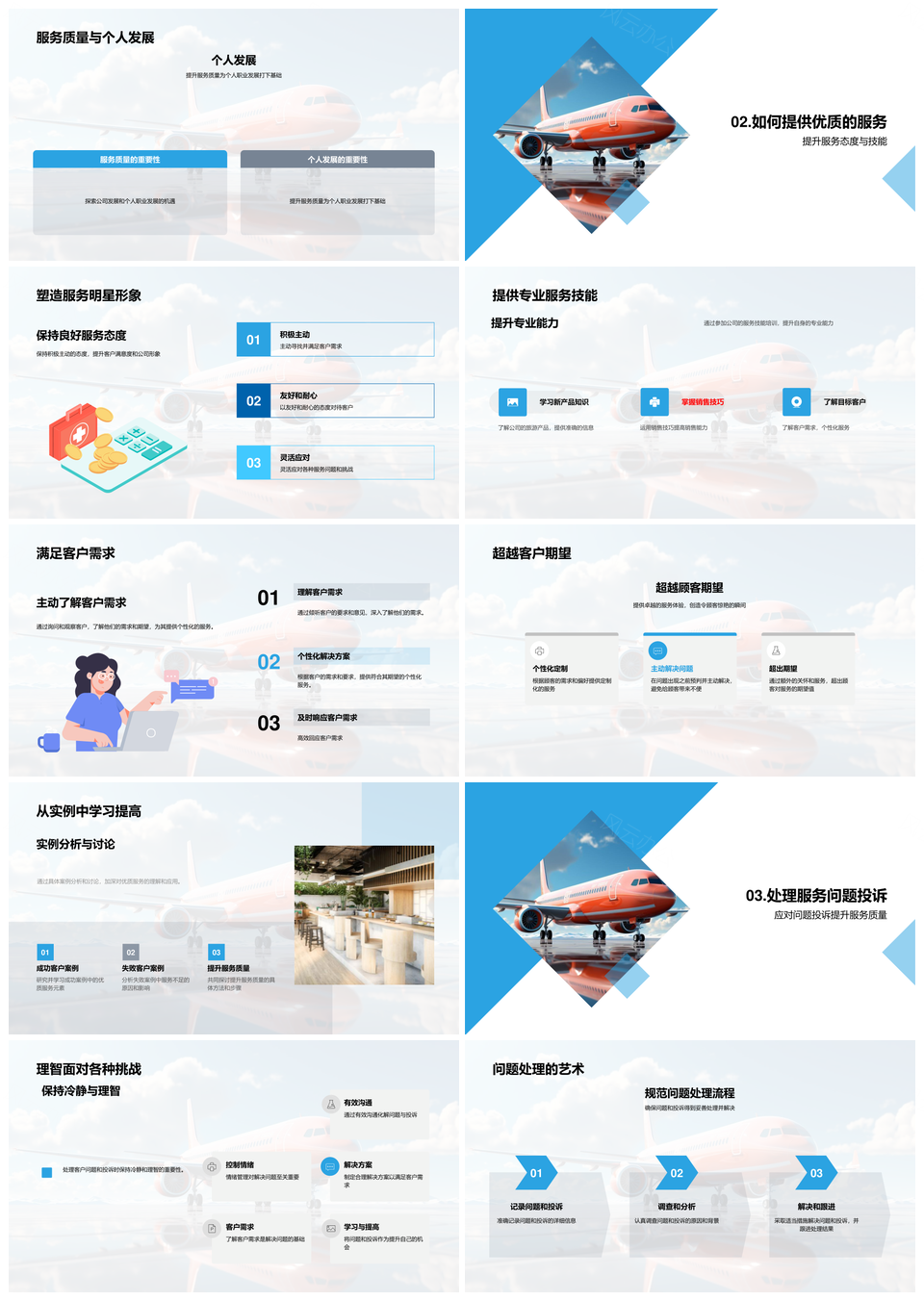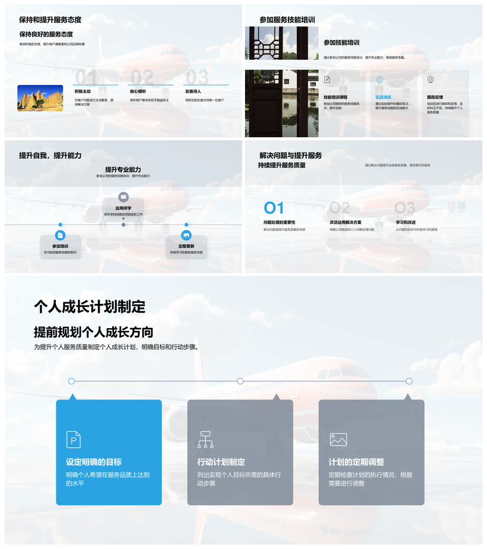 这是一张航空服务技能态度双优超越期望提升品牌满意PPT模板,包含航空、服务、技能、态度、双优、超越、期望、提升、品牌、满意等主题内容,也可用作航空服务技能态度双优超越期望、技能态度双优超越期望提升、态度双优超越期望提升品牌、双优超越期望提升品牌满意、航空服务双优超越期望提升、服务技能态度双优超越、技能态度双优提升品牌、态度双优提升品牌满意、双优超越期望提升满意、超越期望提升品牌满意、航空服务双优提升品牌、技能态度双优超越、双优超越品牌满意、提升品牌满意超越、航空服务双优超越等PPT场景使用。 风云办公提供的航空服务技能态度双优超越期望提升品牌满意PPT模板,下载格式为pptx,一共33页,作品中文字及图均可以修改和编辑,图片更改请在作品中右键图片并更换,文字修改请直接点击文字进行修改。