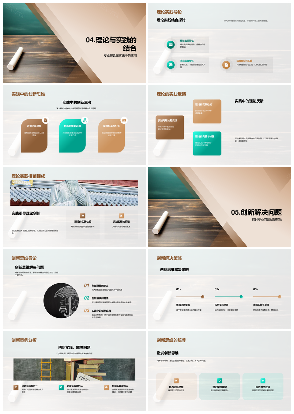 风云办公提供的专业理论实践创新思维解析教育PPT模板,下载格式为pptx,一共28页,作品中文字及图均可以修改和编辑,图片更改请在作品中右键图片并更换,文字修改请直接点击文字进行修改。