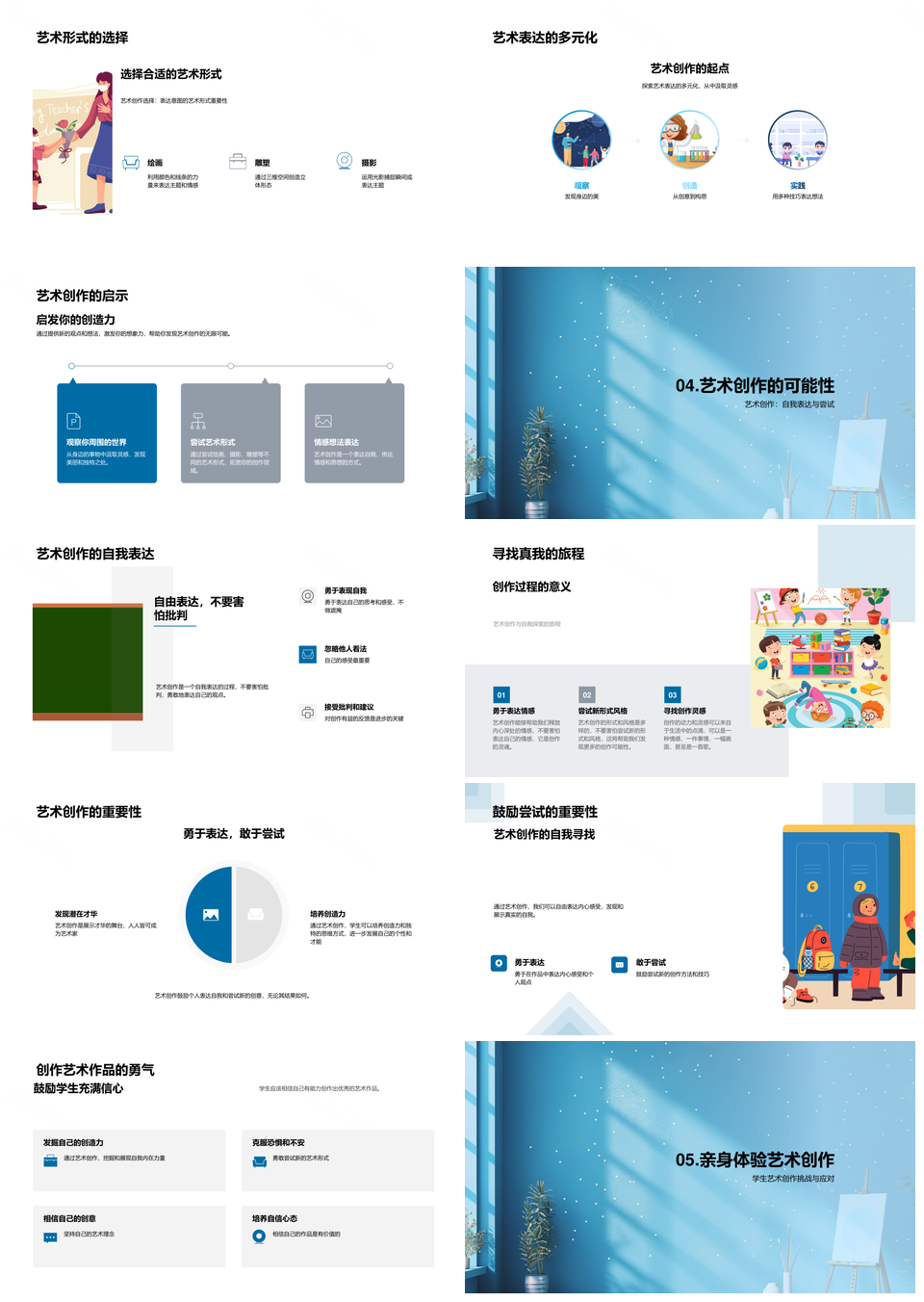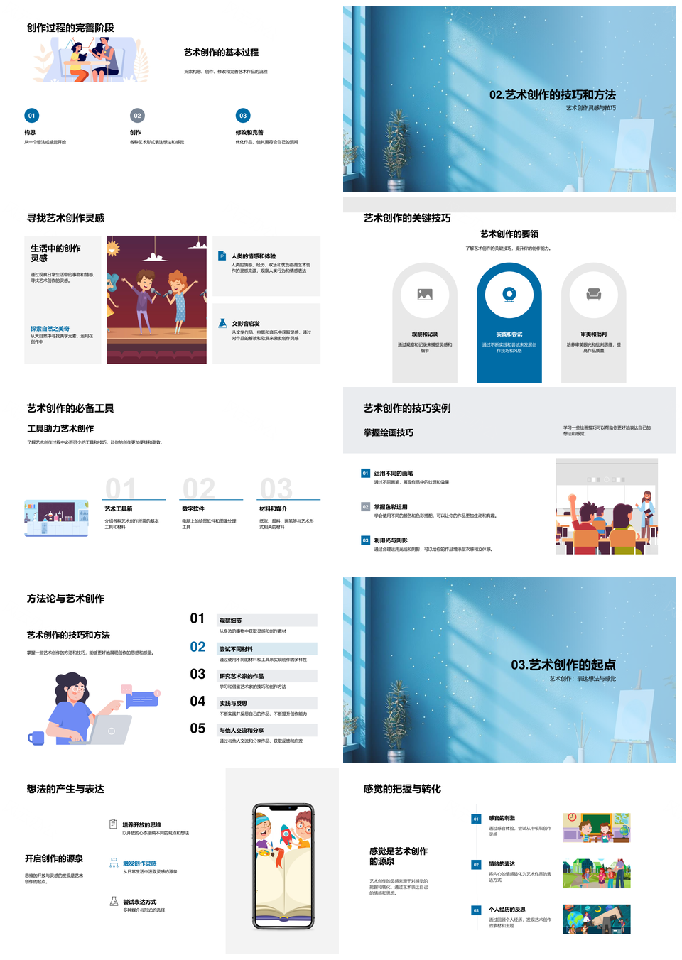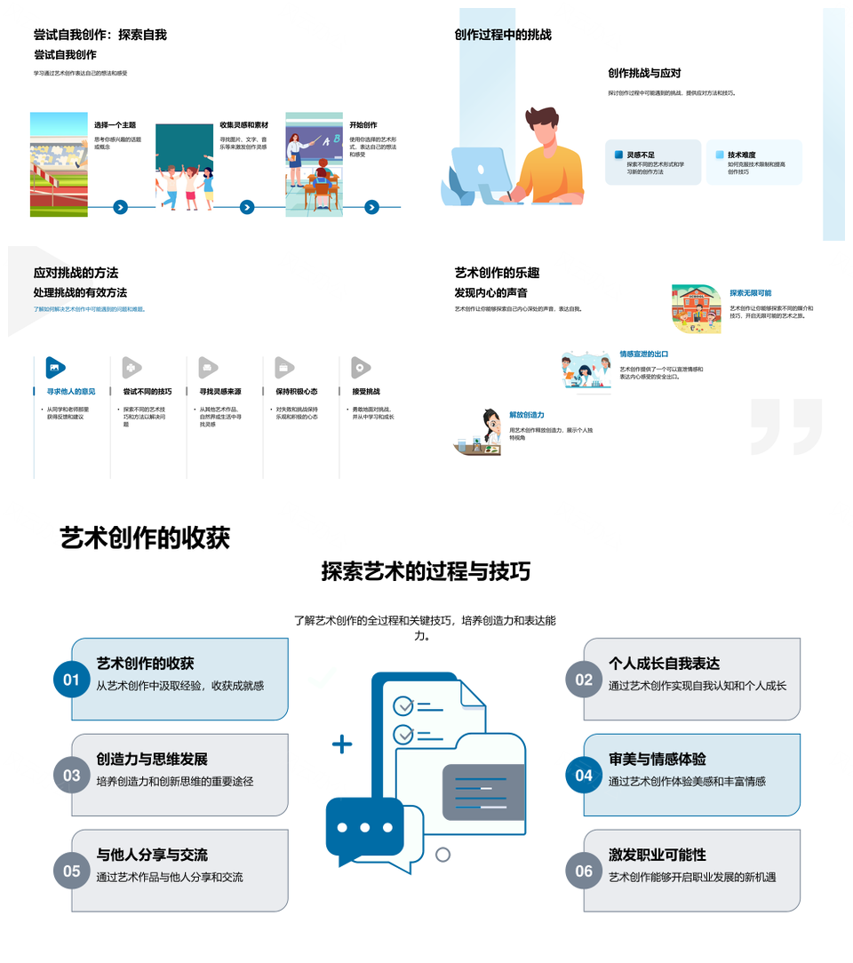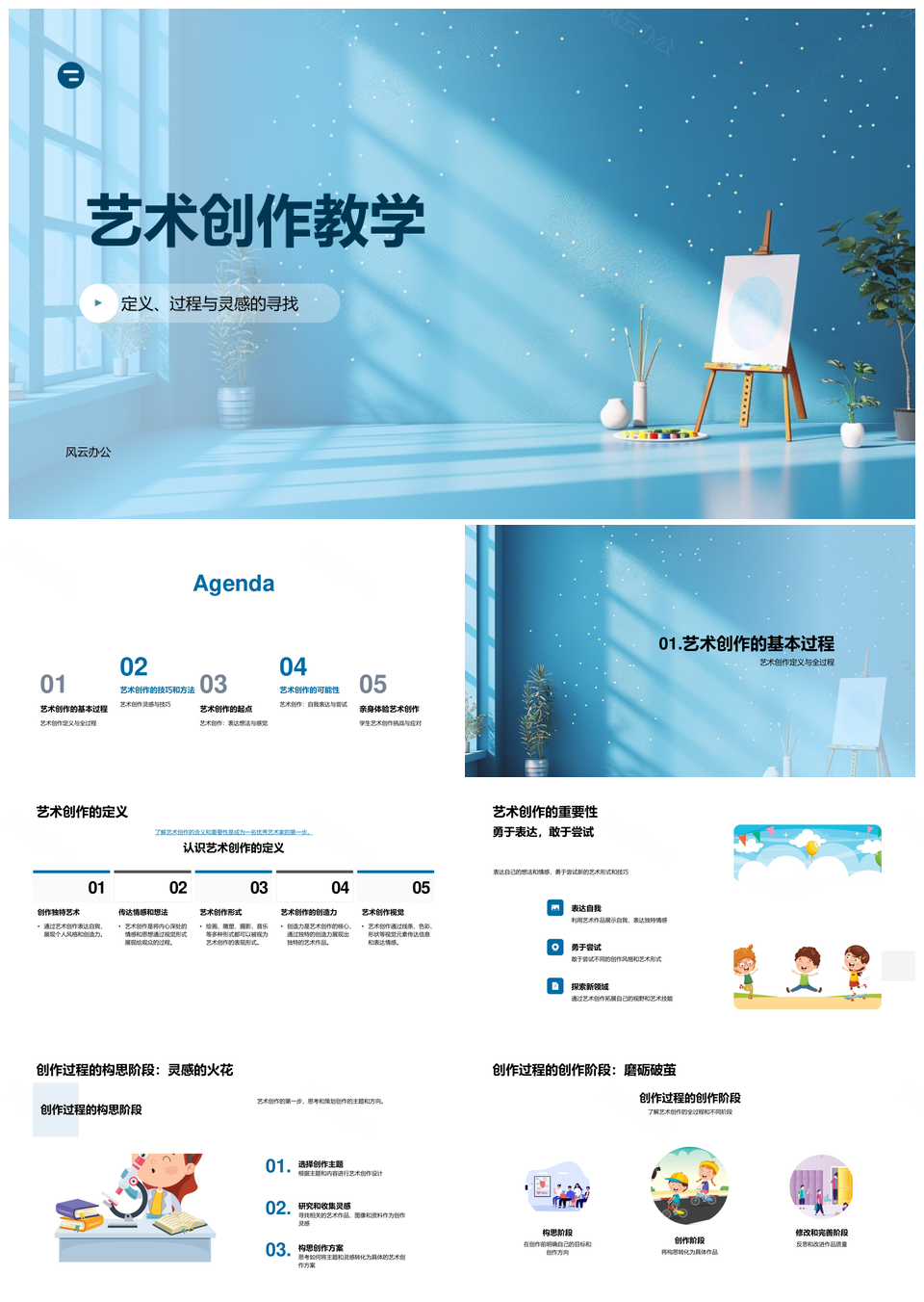 风云办公提供的艺术创作教学灵感过程自我表达起点PPT模板,下载格式为pptx,一共33页,作品中文字及图均可以修改和编辑,图片更改请在作品中右键图片并更换,文字修改请直接点击文字进行修改。