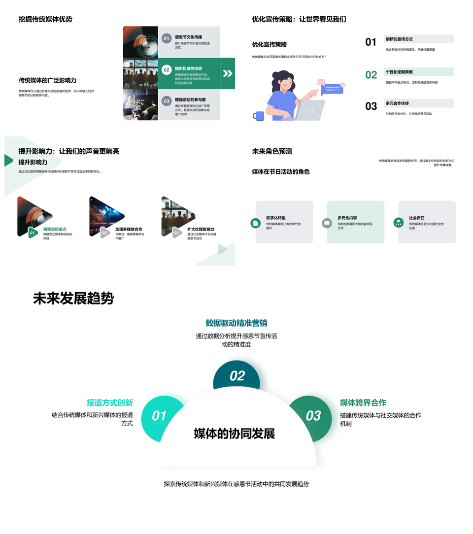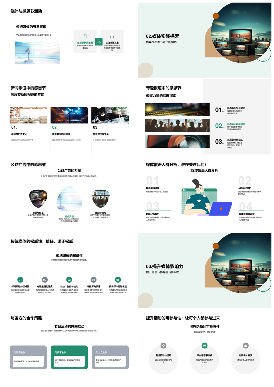 风云办公提供的传统媒体感恩节公益报道影响宣传PPT模板,下载格式为pptx,一共33页,作品中文字及图均可以修改和编辑,图片更改请在作品中右键图片并更换,文字修改请直接点击文字进行修改。
