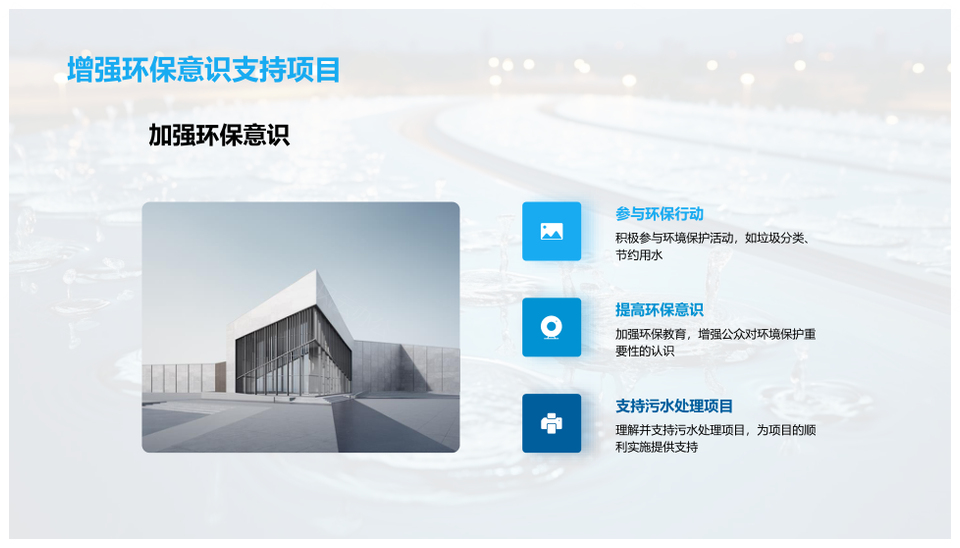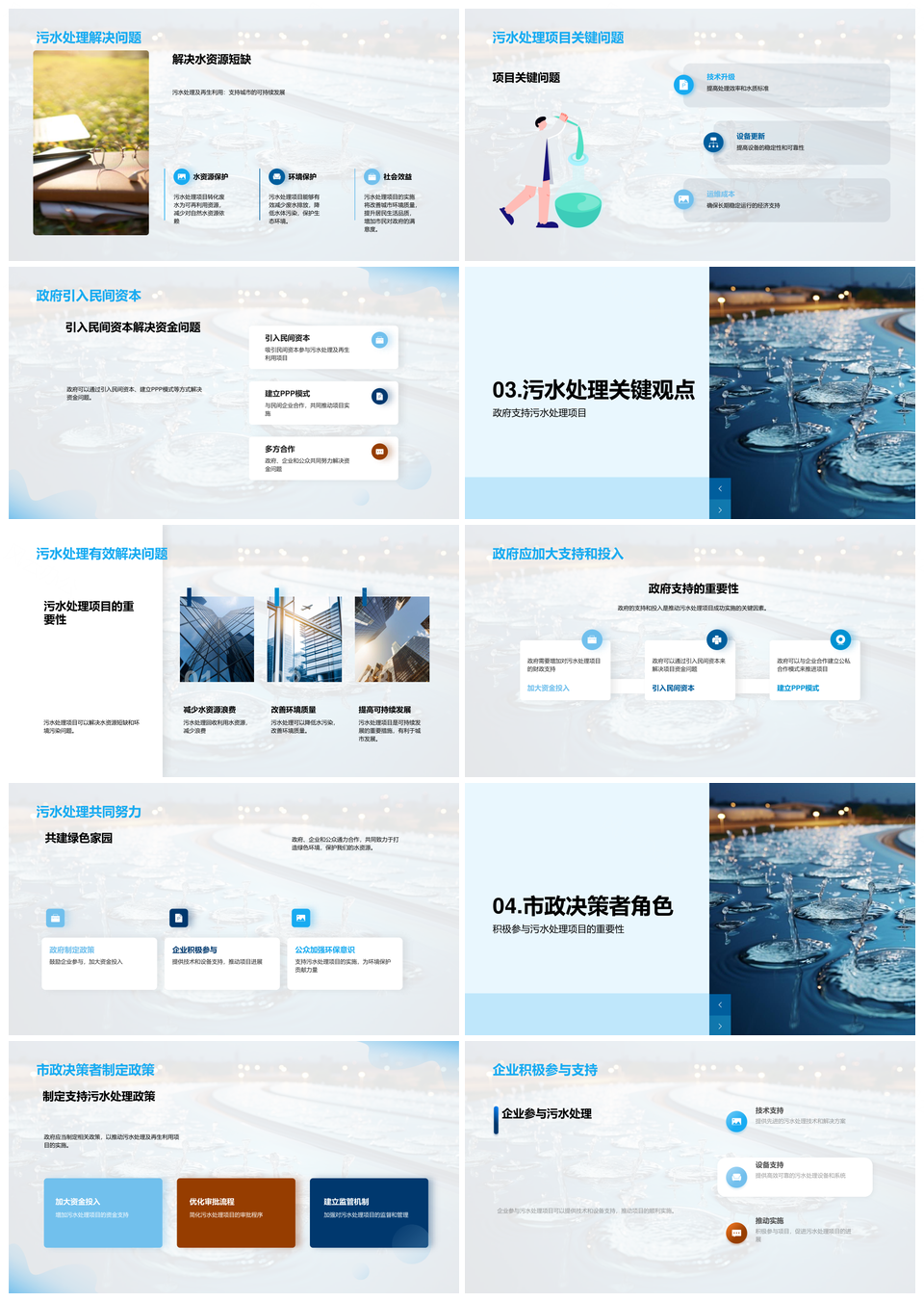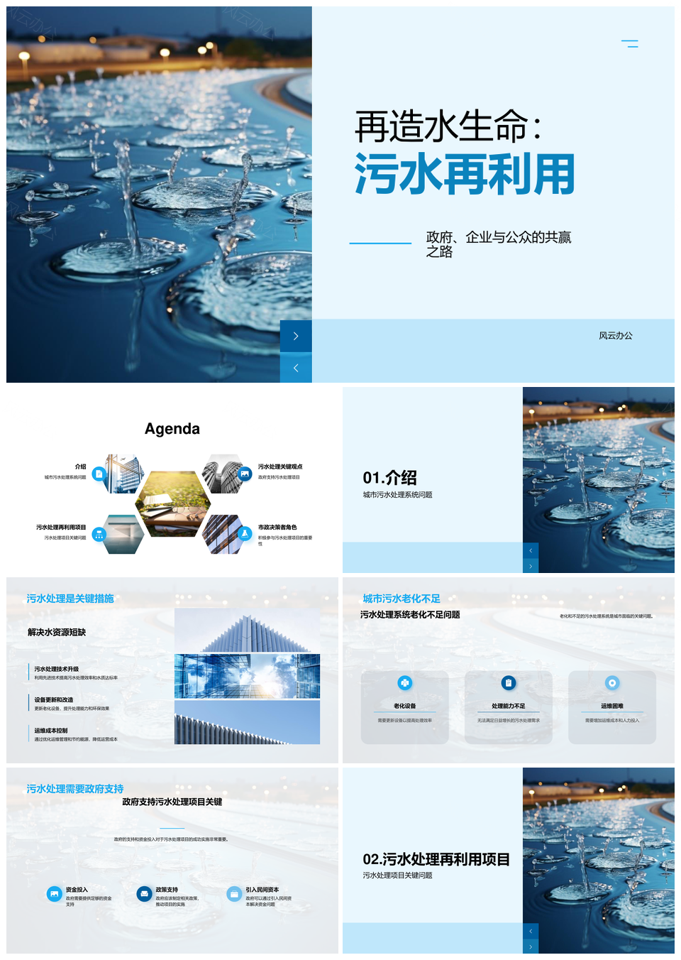 风云办公提供的政府支持升级污水处理系统解缺水减污PPT模板,下载格式为pptx,一共19页,作品中文字及图均可以修改和编辑,图片更改请在作品中右键图片并更换,文字修改请直接点击文字进行修改。