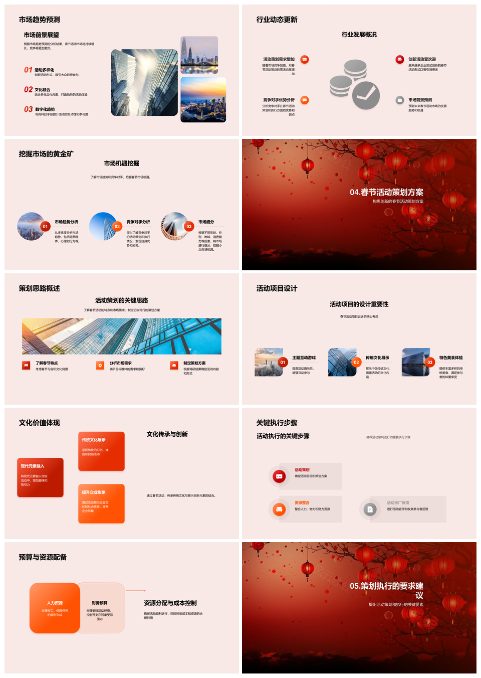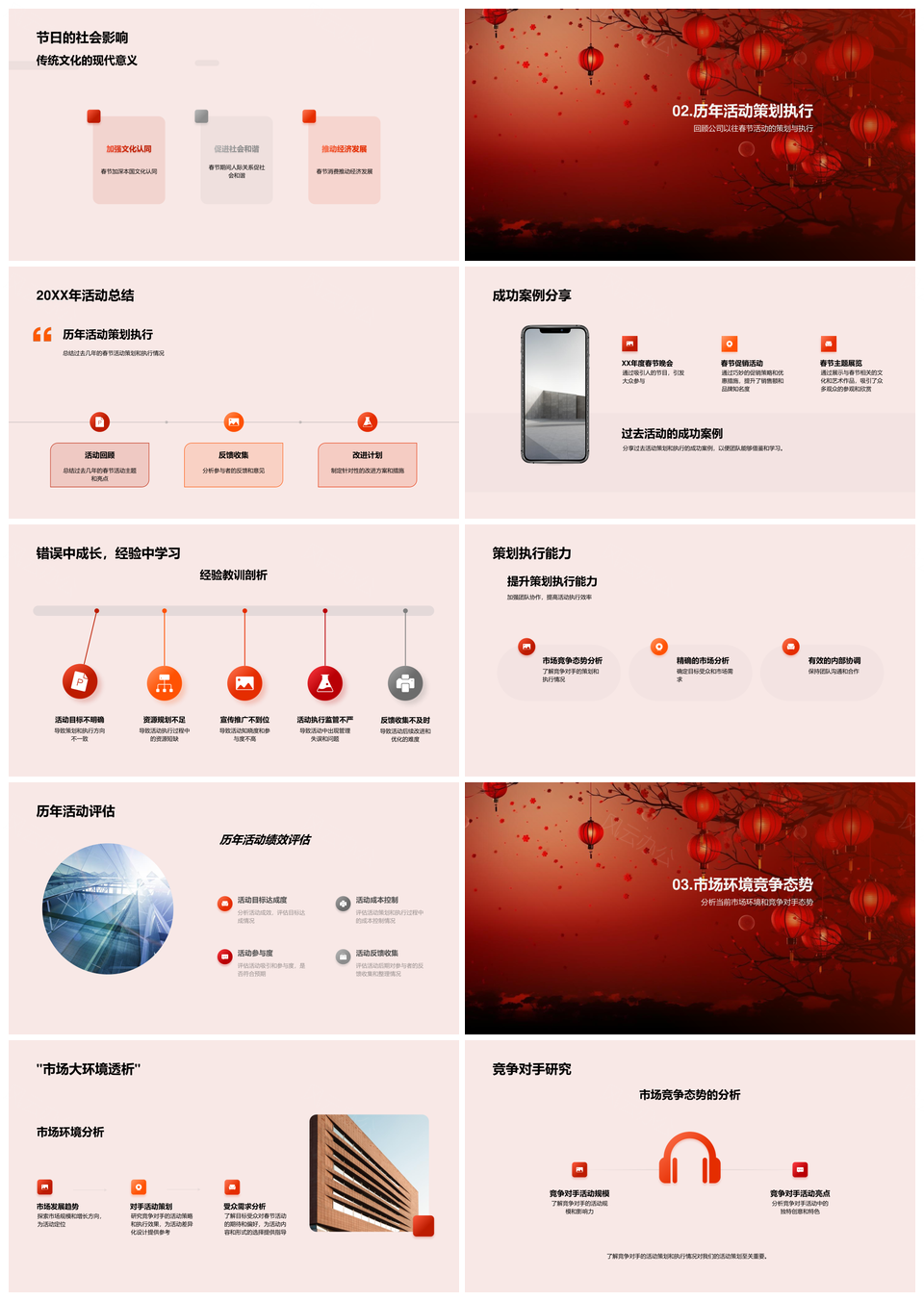 这是一张春节活动全盘策划设计执行市场文化竞争协调灯笼PPT模板,包含春节、活动、全盘、策划、设计、执行、市场、文化、竞争、协调、灯笼等主题内容,也可用作春节活动全盘策划、全盘策划设计执行、策划设计执行市场、设计执行市场文化、市场文化竞争协调、策划设计执行、市场文化竞争、全盘策划设计、执行市场文化、文化竞争协调、春节活动、全盘策划、策划设计、设计执行、市场文化等PPT场景使用。 风云办公提供的春节活动全盘策划设计执行市场文化竞争协调灯笼PPT模板,下载格式为pptx,一共33页,作品中文字及图均可以修改和编辑,图片更改请在作品中右键图片并更换,文字修改请直接点击文字进行修改。