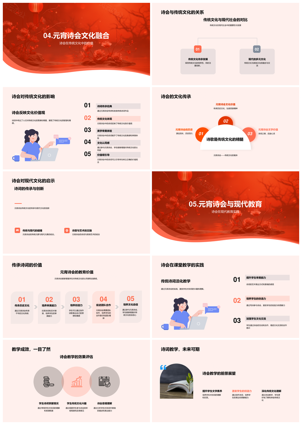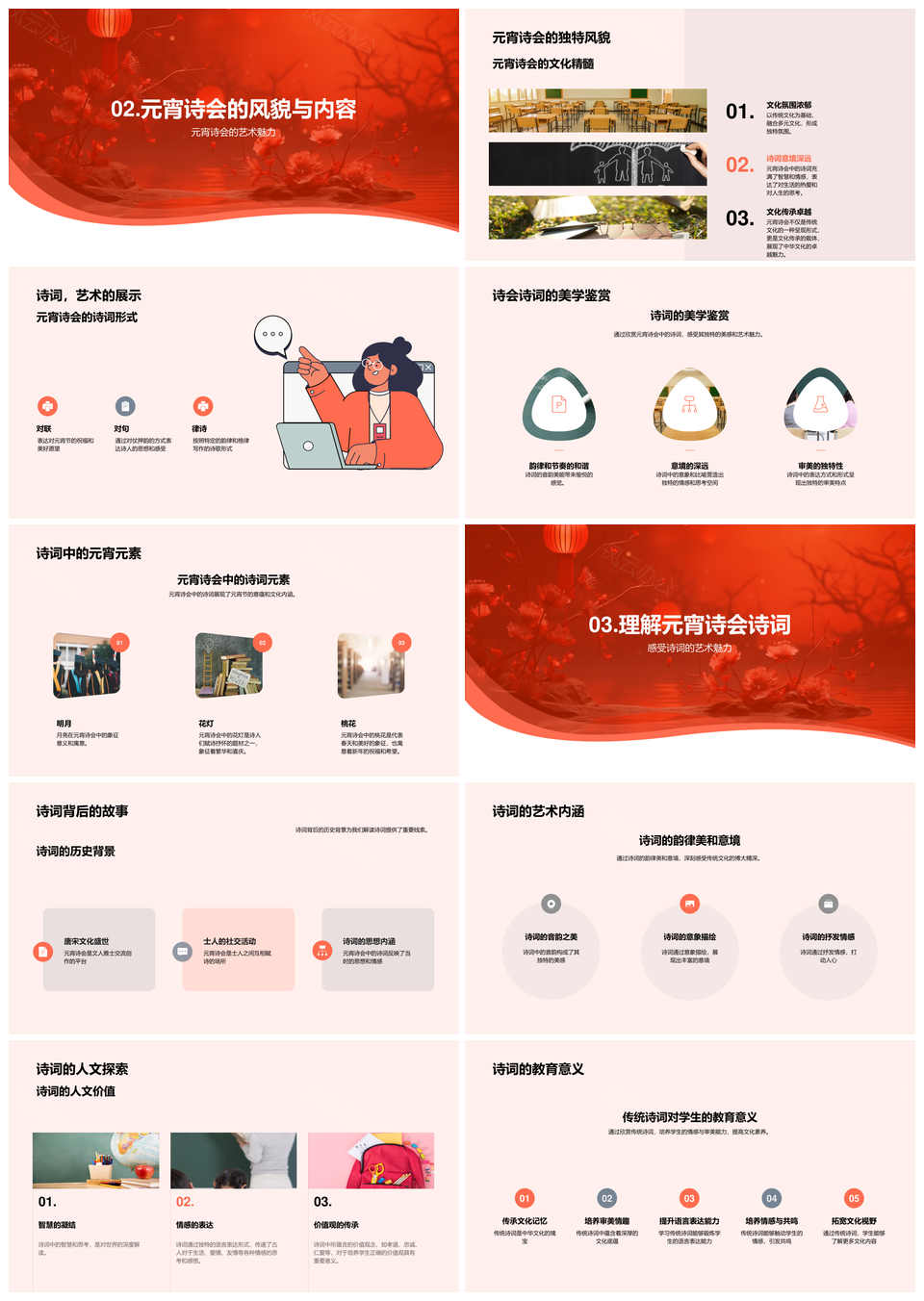 这是一张元宵诗会灯影融传统文教PPT模板,包含元宵、诗会、灯影、传统、文教等主题内容,也可用作元宵诗会灯影传统、元宵诗会传统文教、诗会灯影传统文教、元宵诗会灯影、诗会灯影传统、灯影传统文教、元宵传统文教、诗会传统文教、元宵诗会、诗会灯影、灯影传统、传统文教、元宵灯影、元宵传统、诗会文教等PPT场景使用。 风云办公提供的元宵诗会灯影融传统文教PPT模板,下载格式为pptx,一共28页,作品中文字及图均可以修改和编辑,图片更改请在作品中右键图片并更换,文字修改请直接点击文字进行修改。