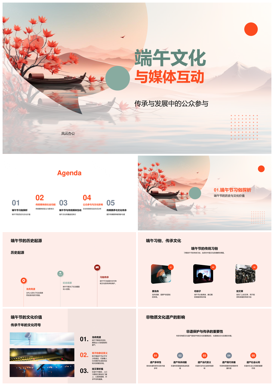 风云办公提供的端午文化媒体互动助力非遗传承PPT模板,下载格式为pptx,一共28页,作品中文字及图均可以修改和编辑,图片更改请在作品中右键图片并更换,文字修改请直接点击文字进行修改。