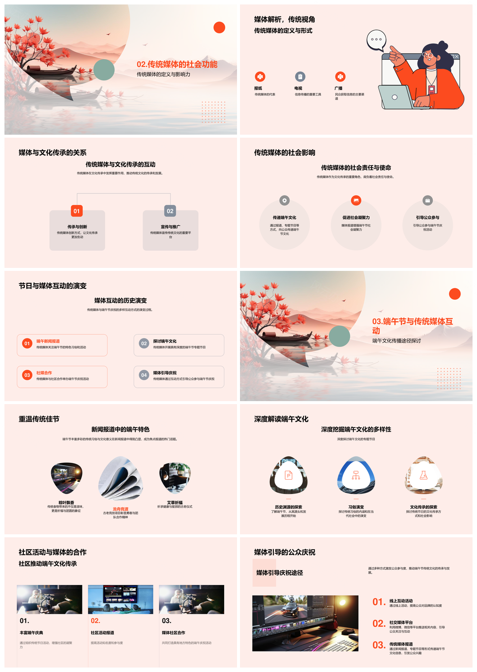这是一张端午文化媒体互动助力非遗传承PPT模板,包含端午文化、媒体互动、助力、非遗传承等主题内容,也可用作端午文化媒体互动、文化媒体互动助力、媒体互动助力非遗、互动助力非遗传承、端午文化助力非遗、非遗传承媒体互动、文化互动助力非遗、媒体助力非遗传承、端午文化媒体助力、文化助力非遗传承、端午互动非遗传承、媒体互动非遗助力、非遗传承端午文化、端午非遗文化传承、端午媒体助力非遗等PPT场景使用。