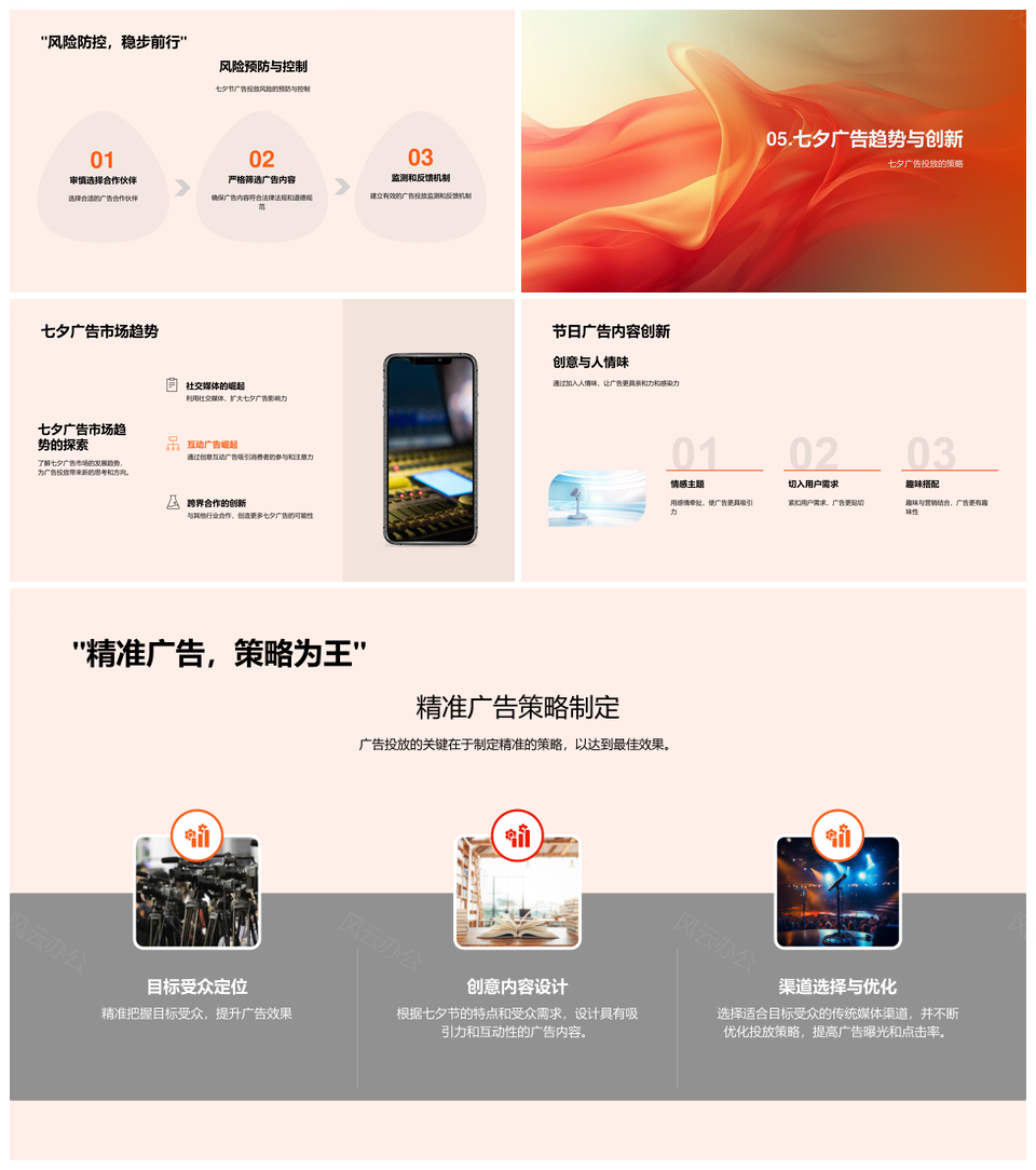 这是一张七夕广告策略效果提升风险规避投放分析消费者需求传统媒体商业价值PPT模板,包含七夕、广告策略、效果提升、风险规避、投放、分析、消费者需求、传统媒体、商业价值等主题内容,也可用作七夕广告策略效果、广告策略效果提升、策略效果提升风险、效果提升风险规避、提升风险规避投放、风险规避投放分析、规避投放分析消费者、投放分析消费者需求、分析消费者需求传统、消费者需求传统媒体、需求传统媒体商业、传统媒体商业价值、广告效果提升风险、效果风险规避投放、策略提升风险规避等PPT场景使用。 风云办公提供的七夕广告策略效果提升风险规避投放分析消费者需求传统媒体商业价值PPT模板,下载格式为pptx,一共23页,作品中文字及图均可以修改和编辑,图片更改请在作品中右键图片并更换,文字修改请直接点击文字进行修改。